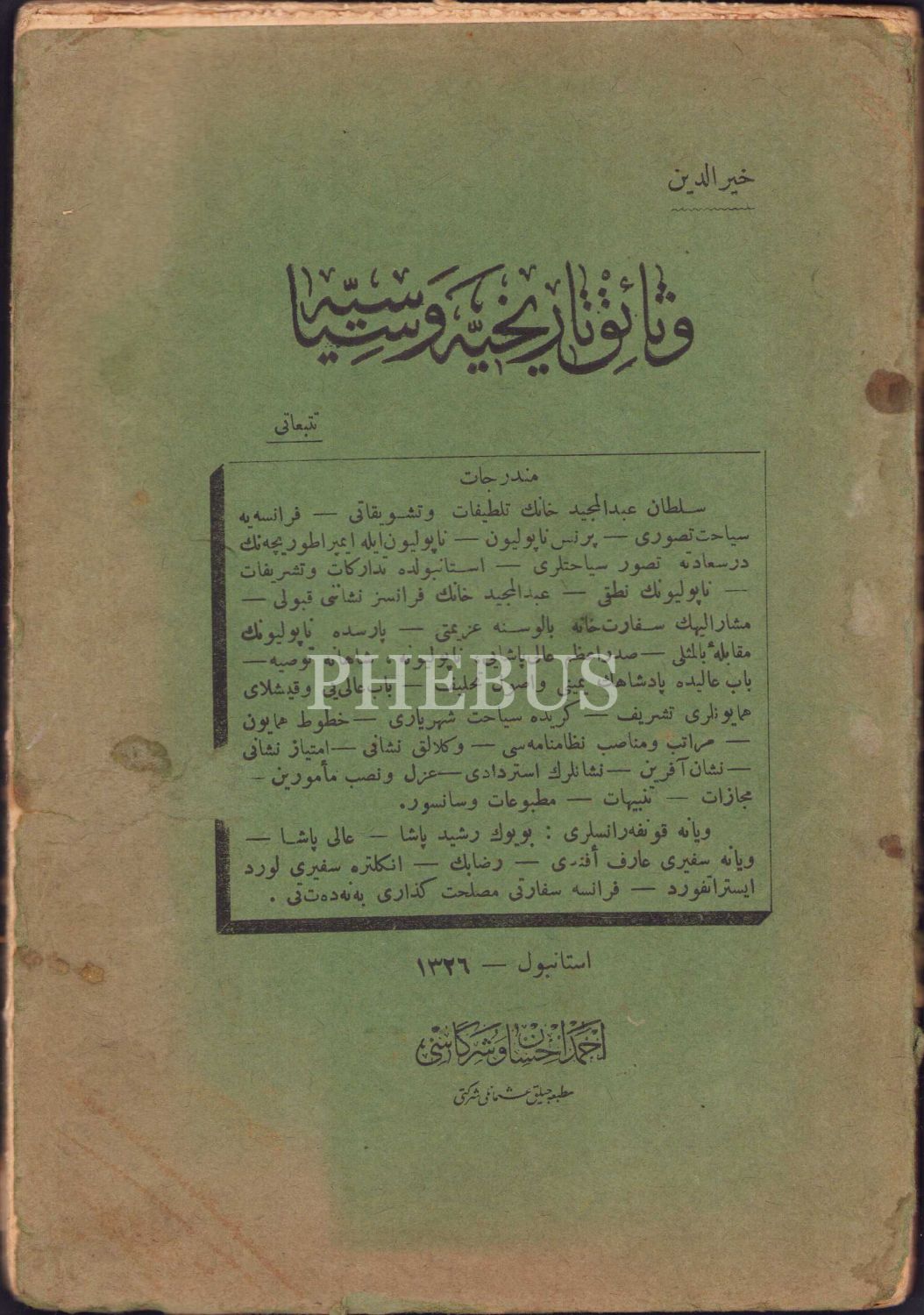 Vesaik-i Tarihiyye ve Siyasiyye I. Cilt, Hayreddin Nedim Göçen, Osmanlıca, Ahmed İhsan ve Şürekası Matbaası, İstanbul 1326, 104 sayfa, 14x20 cm