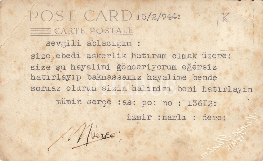 Bahriyeli, Foto Hamza Rüstem İzmir damgalı, 1944, ithaflı, bir kenarı kırık