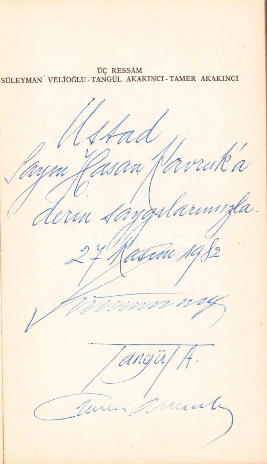 Üç Ressam Süleyman Velioğlu - Tangül Akakıncı - Tamer Akakıncı, Yazarlarından Ressam Hasan Kavruk'a imzalı ve ithaflı, İstanbul 1980,12x21 cm