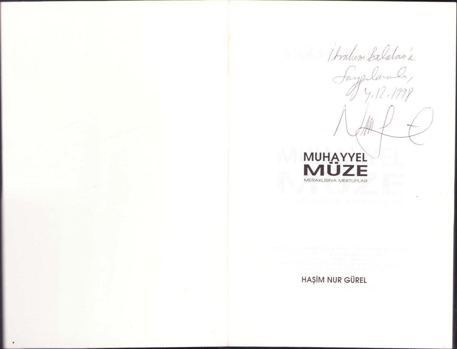 Muhayyel Müze Meraklısına Mektuplar, Haşim Nur Gürel'den İbrahim Balaban'a imzalı ve ithaflı, İstanbul 1998, 182 sayfa, 20x13 cm