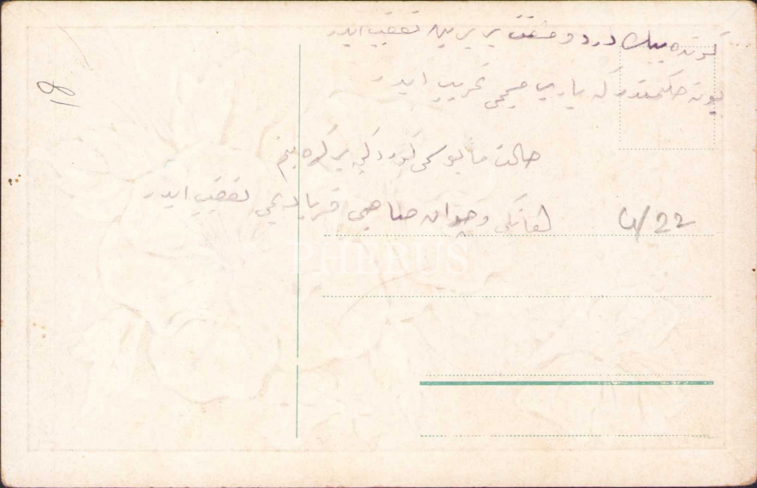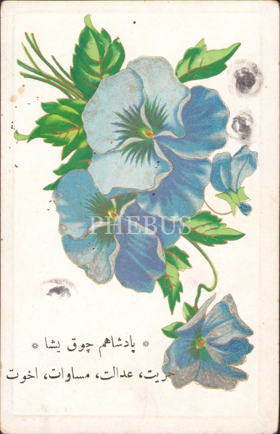 Osmanlı dönemi kartpostal, Osmanlıca "Padişahım Çok Yaşa" ve "Hürriyet, Adalet, Müsavat, Uhuvvet" yazılı, İkinci Meşrutiyet temalı, arkası Osmanlıca dötlük, 14x9 cm