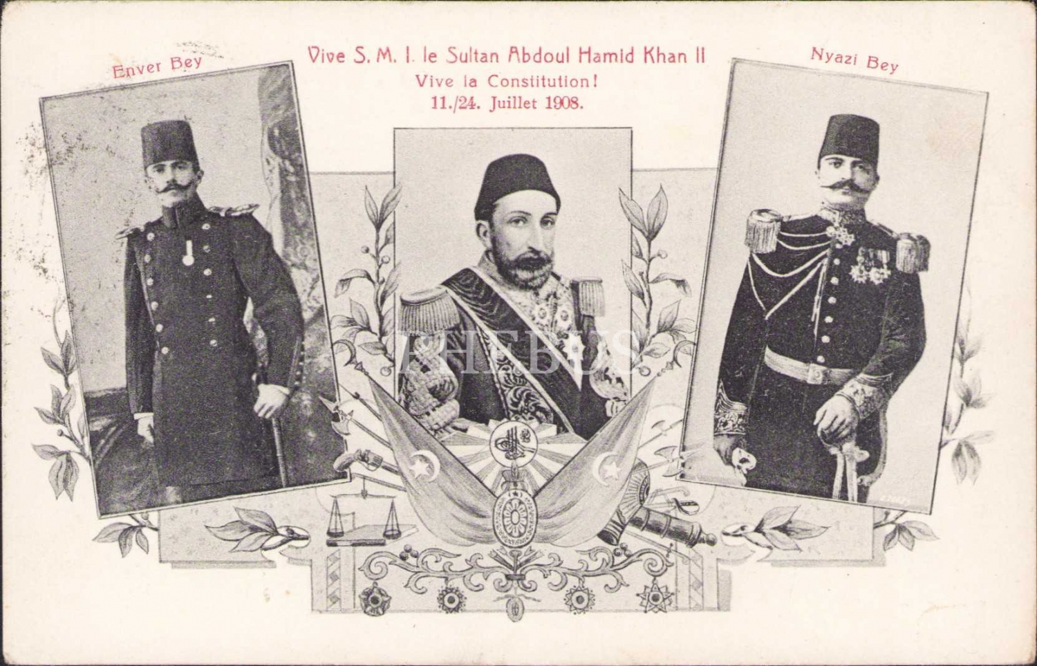 Osmanlı dönemi kartpostal, Sultan II. Abdülhamid, Enver Paşa ve Resneli Niyazi, II. Meşrutiyet temalı, Fransızca "Vive la Constitution yazılı", arkası Constantinople damgalı, 1909 tarihli.