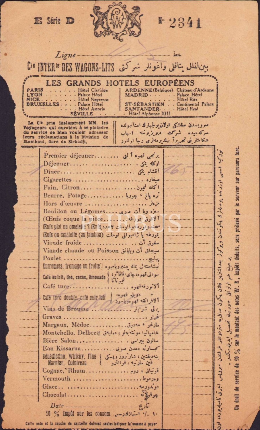 Wagons Lits Orient Ekspres adisyon, Osmanlıca ve Fransızca, 12x21 cm