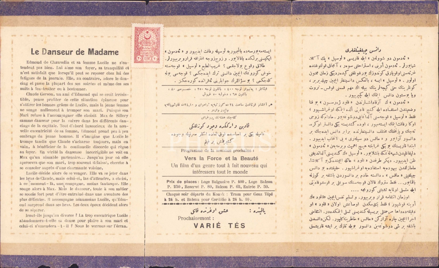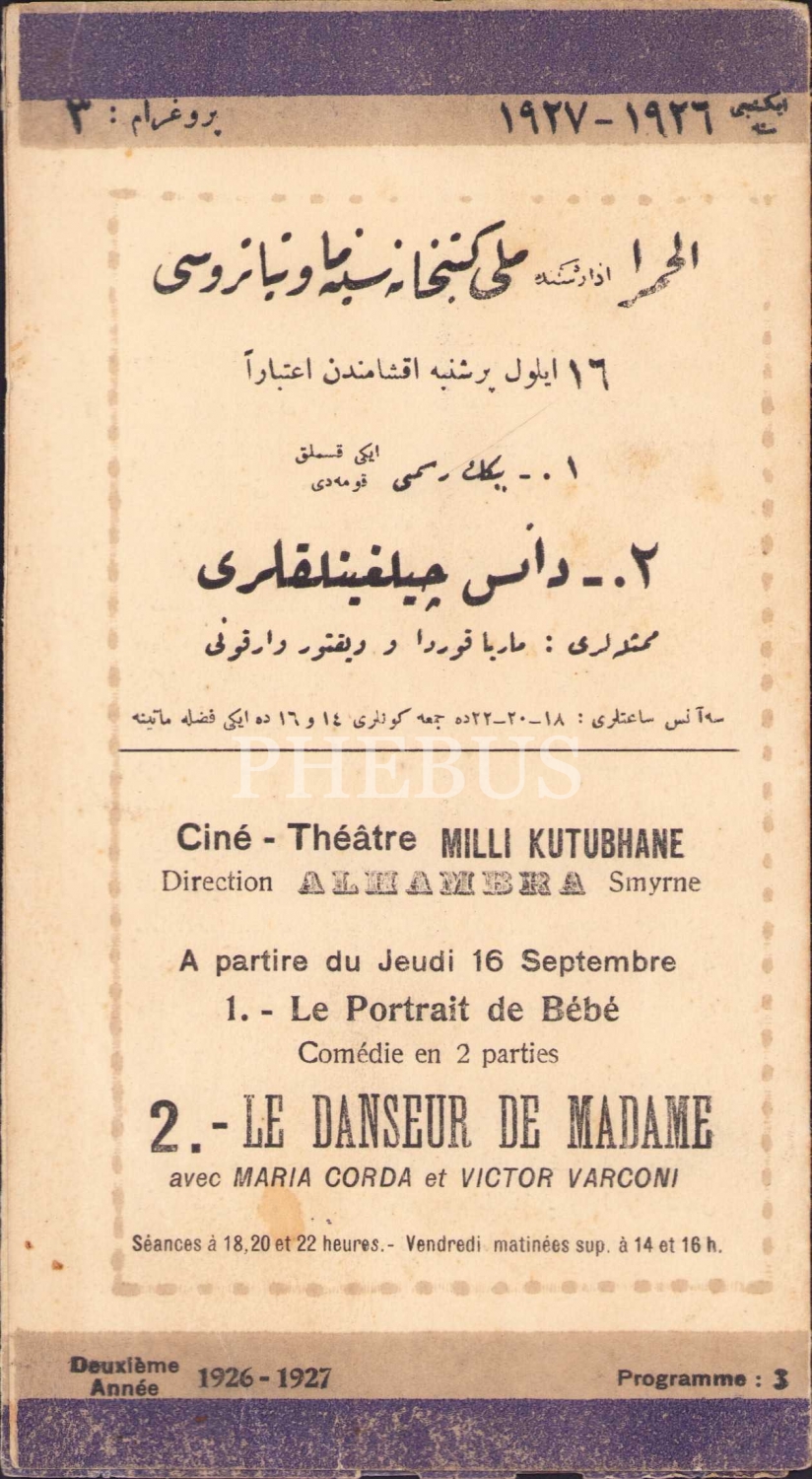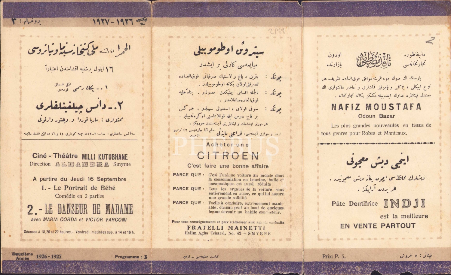 İzmir [Smyrne] El-Hamra Sineması'nın Sinema ve Tiyatro el ilanı, reklamlı, Nafiz Mustafa, Citroen, 1926-1927 tarihli, Osmanlıca ve Fransızca, pullu, 10x19 cm