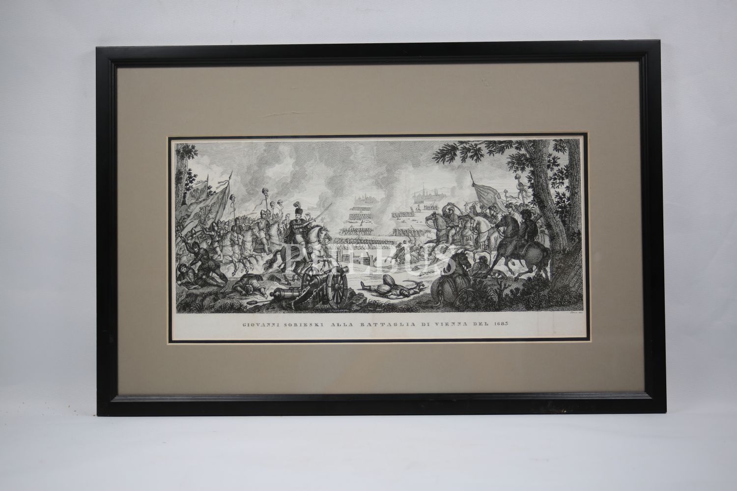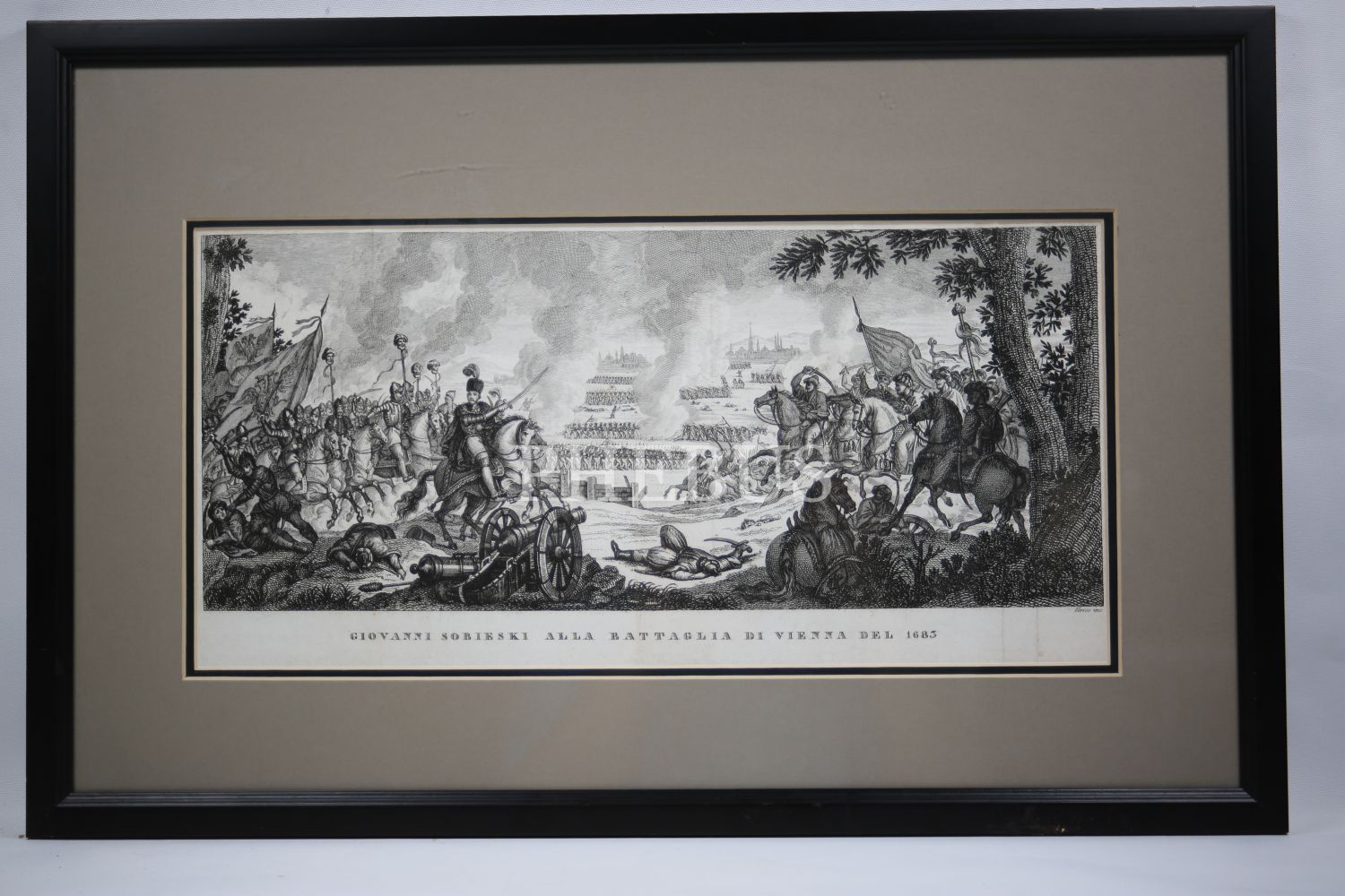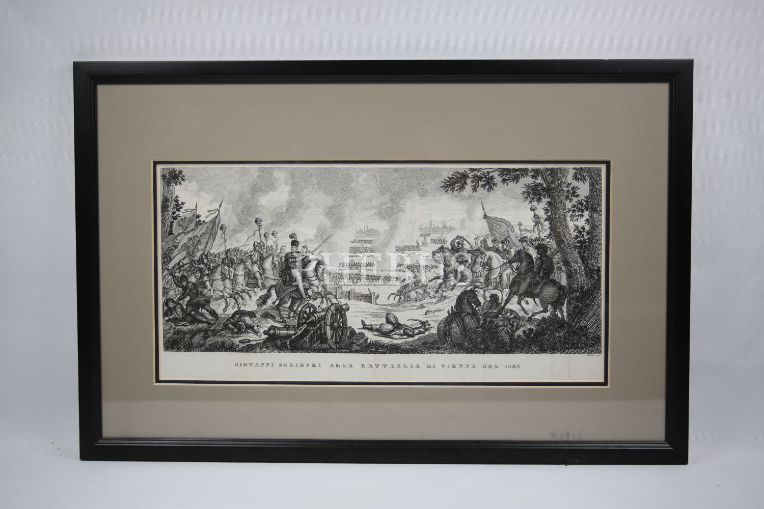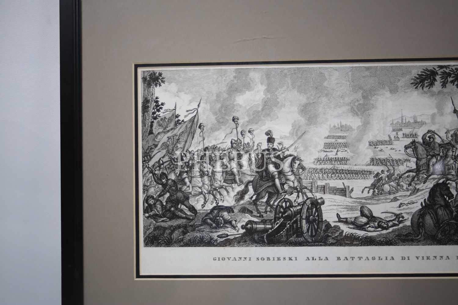 1683 Viyana Kuşatması'nda Giovanni Sobieski gravür, İtalyanca "Giovanni Sobieski Alla Battaglia Di Vienna Del 1683" yazılı, çerçeveli, 40x20 cm
