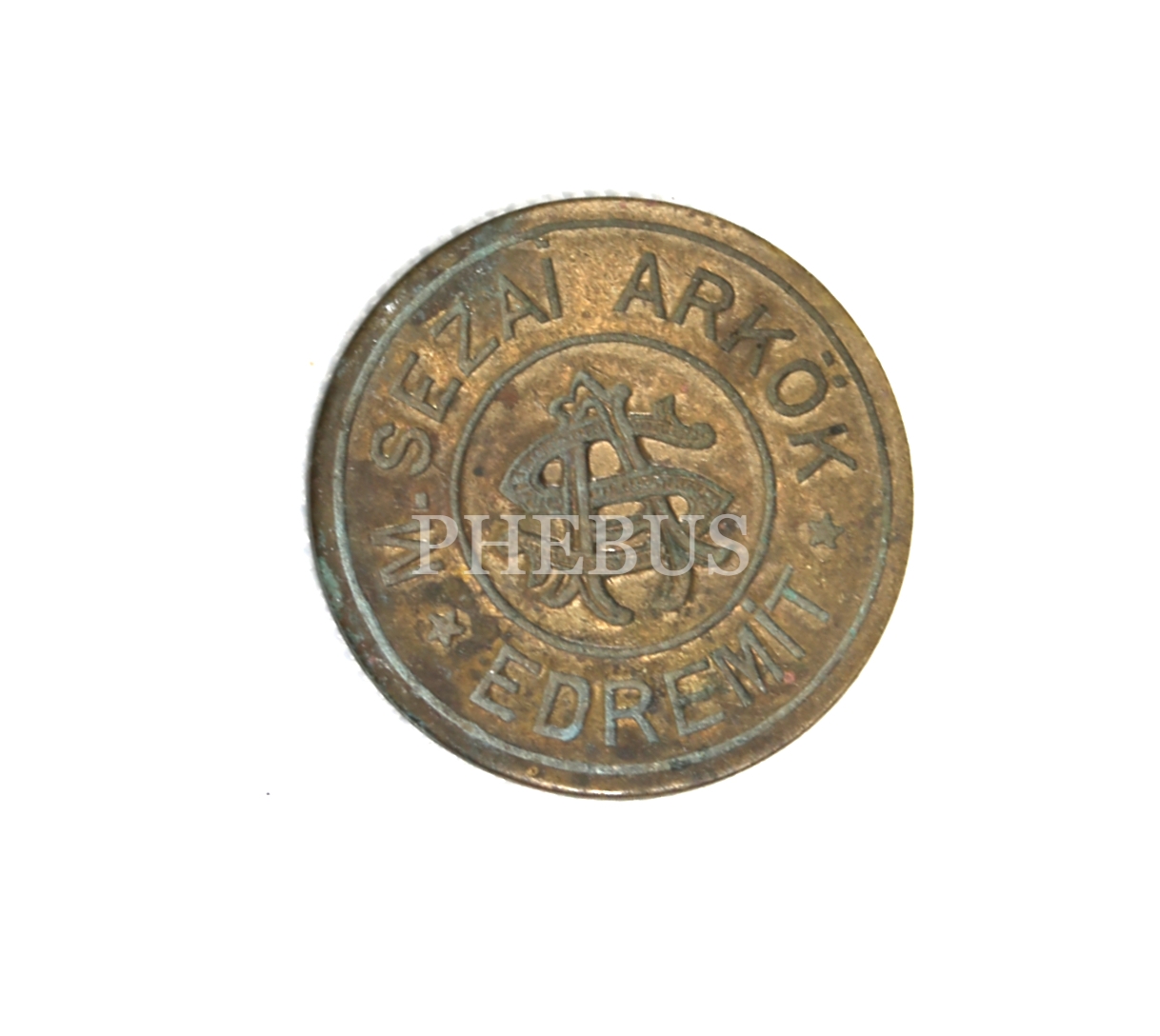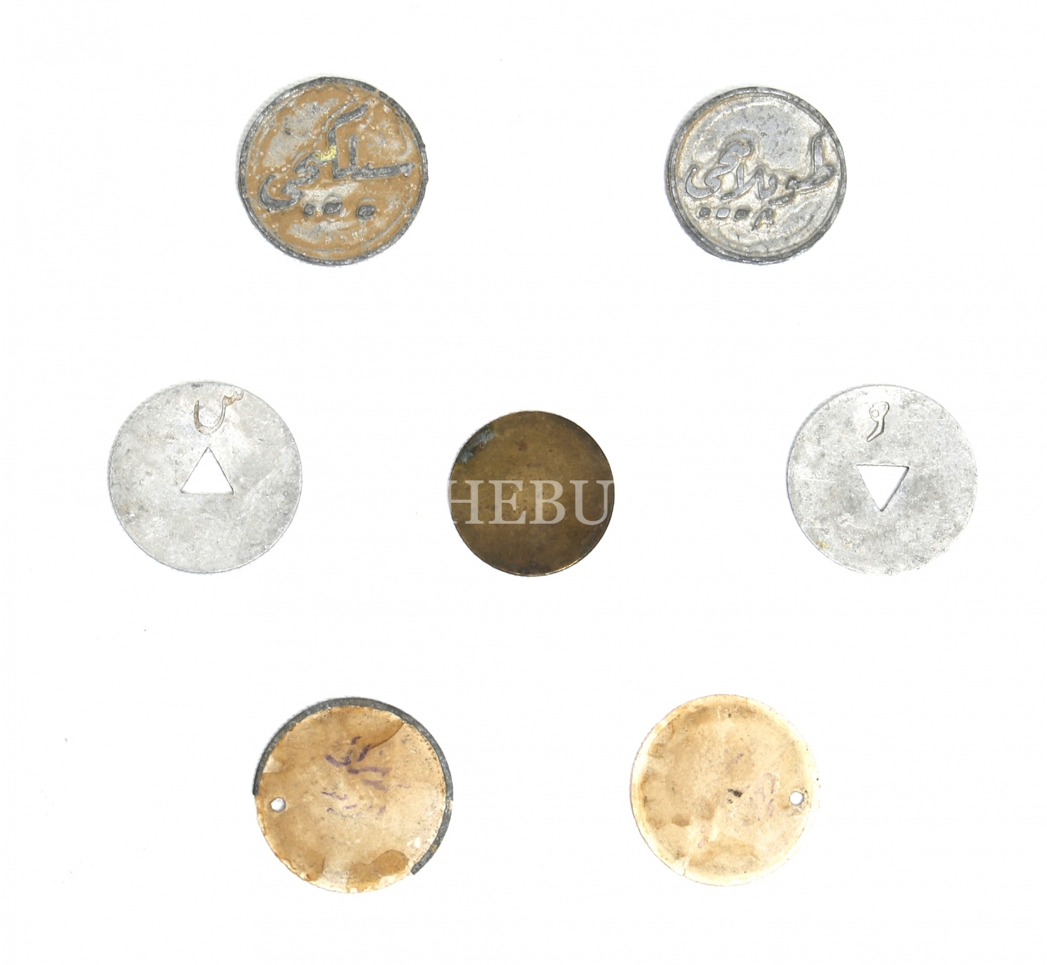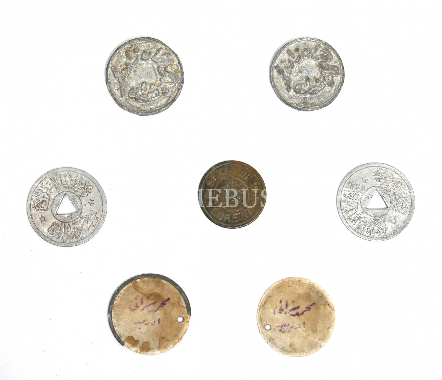 Osmanlı dönemi zeytin toplama jetonları, üzerilerinde "Toplayıcı", "Hacı Osmanzade Mehmed", "Ali Rıza Beyzade Mehmed Sezai" yazılı, 7 adet, 1 tanesi latin harfli, ortalama 4 cm