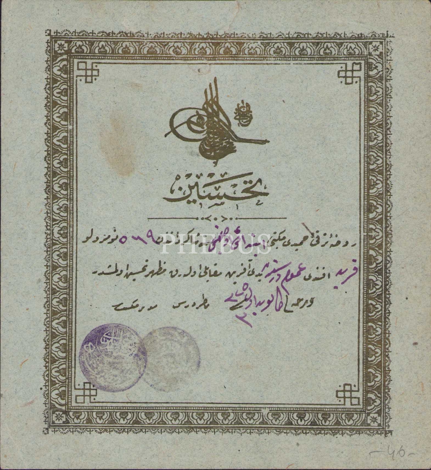Ravza-i Terakki Mektebi'ne ait tahsin belgesi, Osmanlıca, 1325 tarihli, 14x14 cm