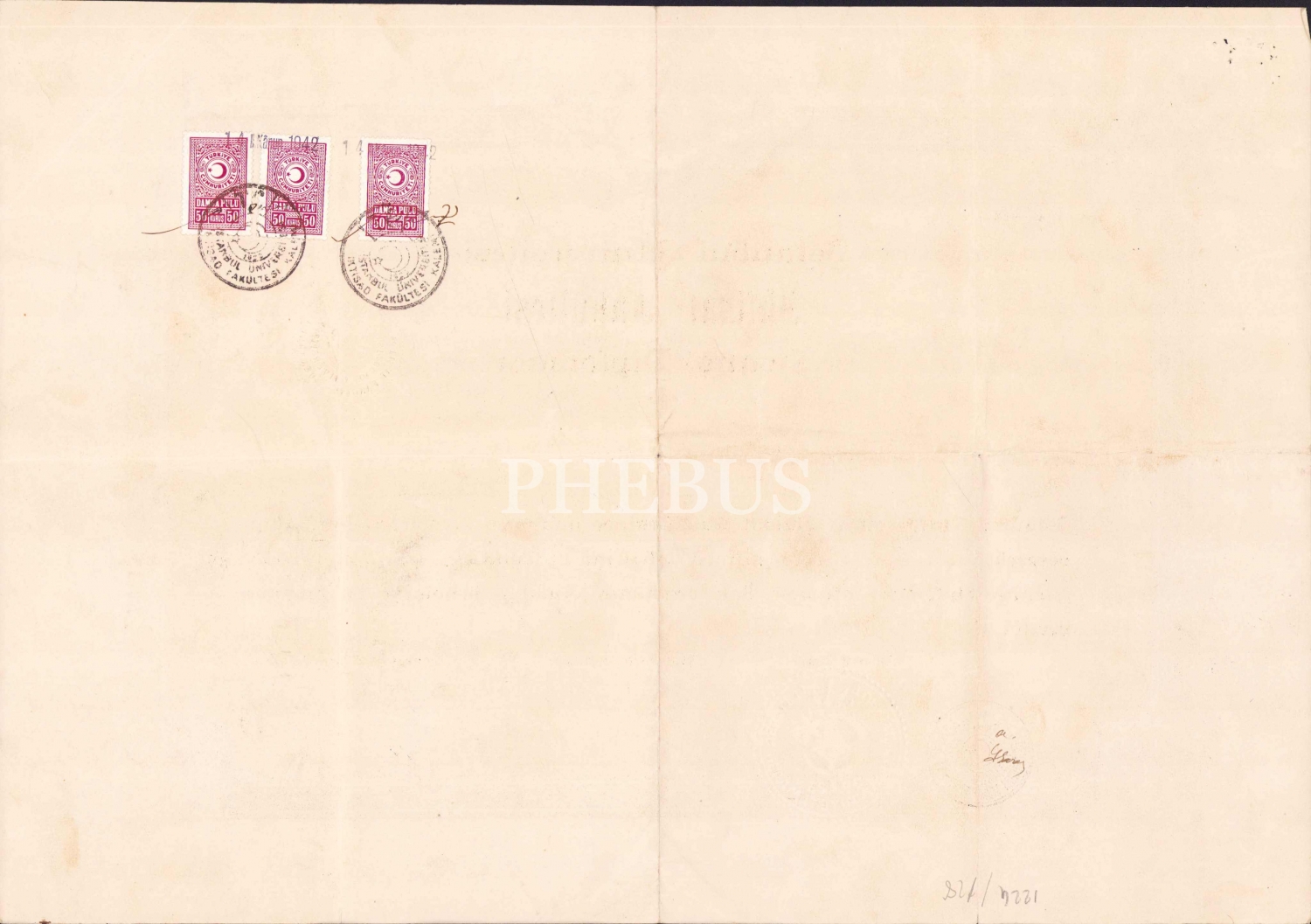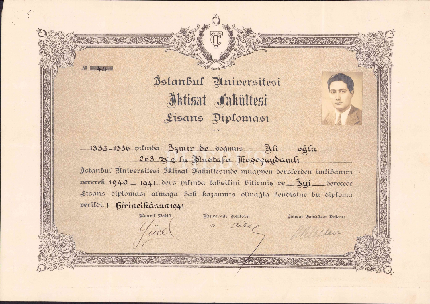 Maarif Vekili Hasan Ali Yücel ve Üniversite rektörü Cemil Bilsel ıslak imzalı, İstanbul Üniversitesi İktisat Fakültesi Lisans Diploması, 1941 tarihli, 43x30 cm
