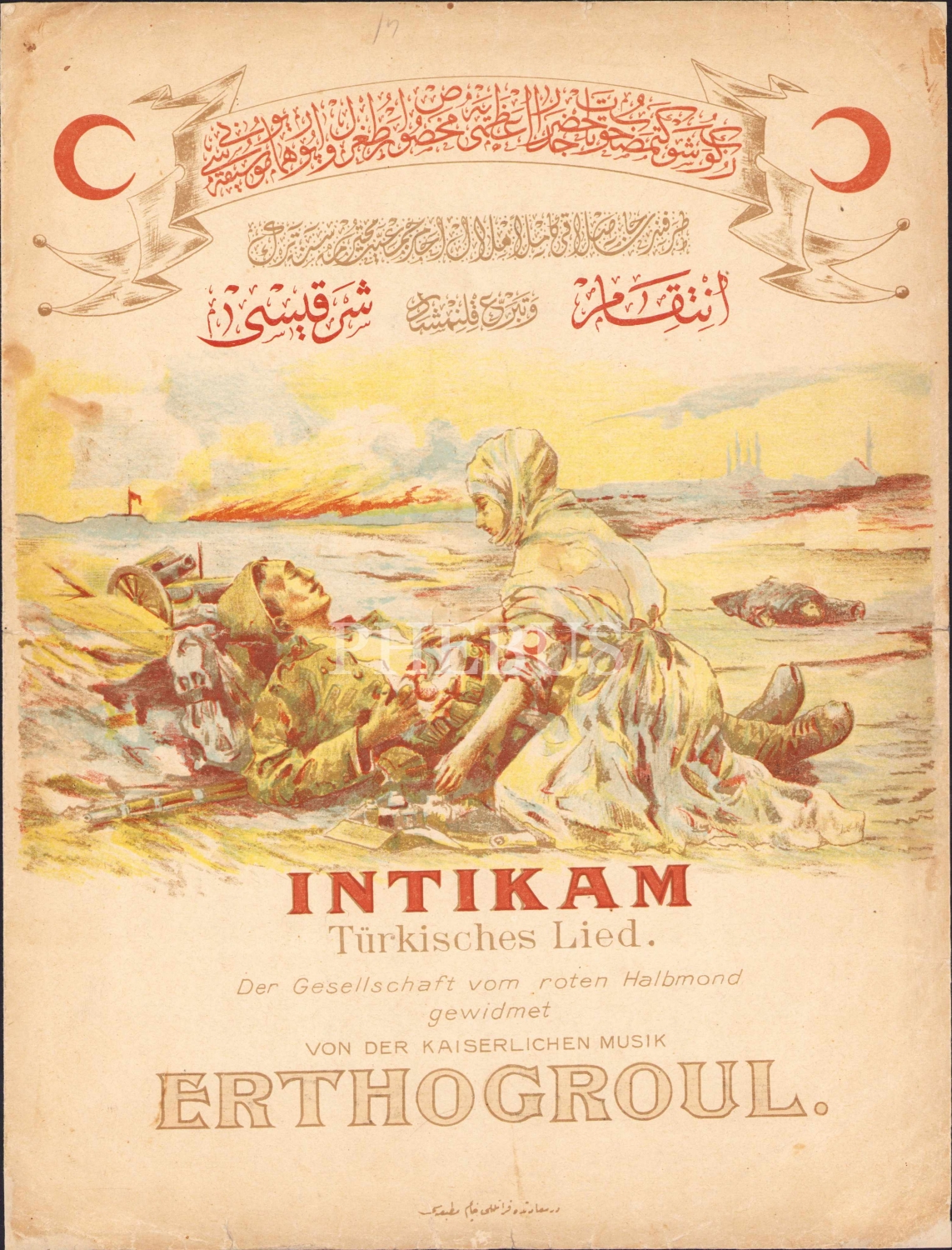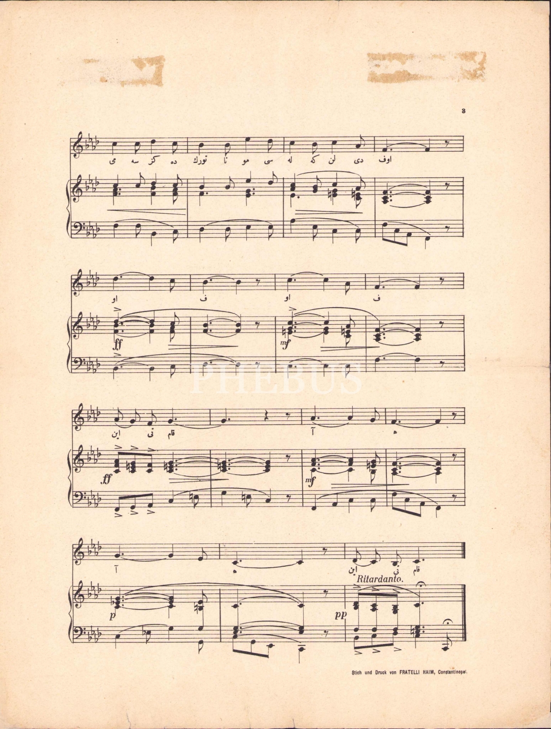 Kaybedilen Balkan Harbi Sonrası Her Yerde Yankılanan Şarkı: İntikam Şarkısı, Fratelli Haim Matbaası Matbu Nota, 4 sayfa, Osmanlıca ve Almanca, 27x36 cm, haliyle.