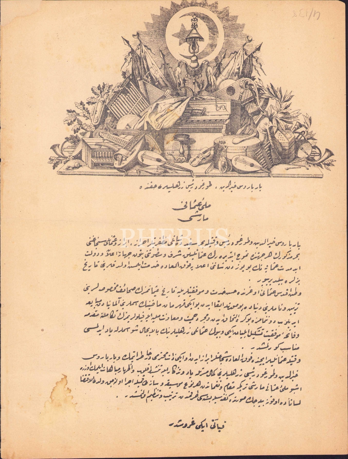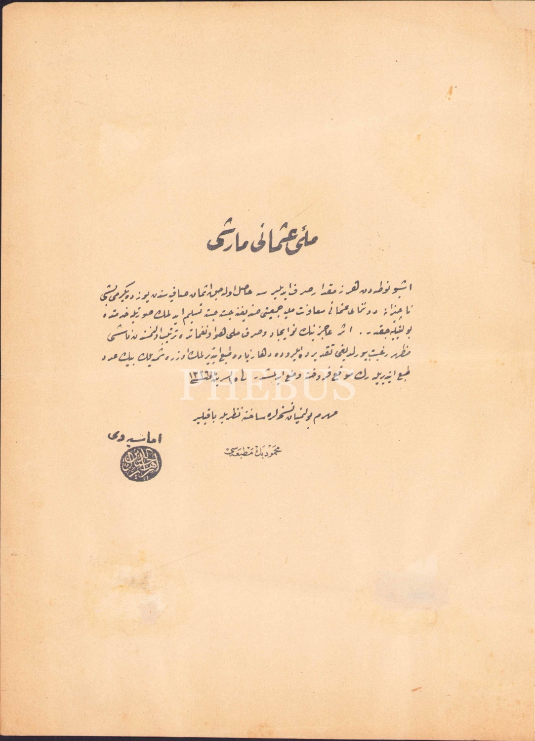 Milli-i Osmani Marşı "Donanmamız Açılsın Bahre Heybetle Mehabetle [Yücelikle]", 4 sayfa, Osmanlıca, 23x30 cm