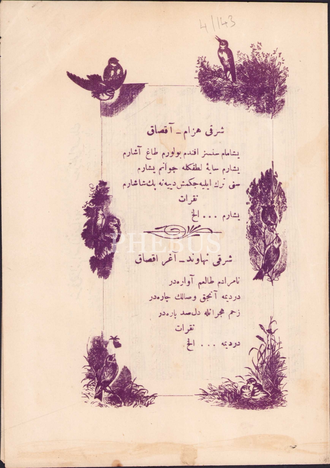 Gıda-yı Ruh Müntehabat Şarkı ve Kantolar, Şarkı Hüzzam Selanikli Ahmed Bey ve Hacı Arif Bey'in eserleri, 14x21 cm 4 sayfa, 14x20 cm