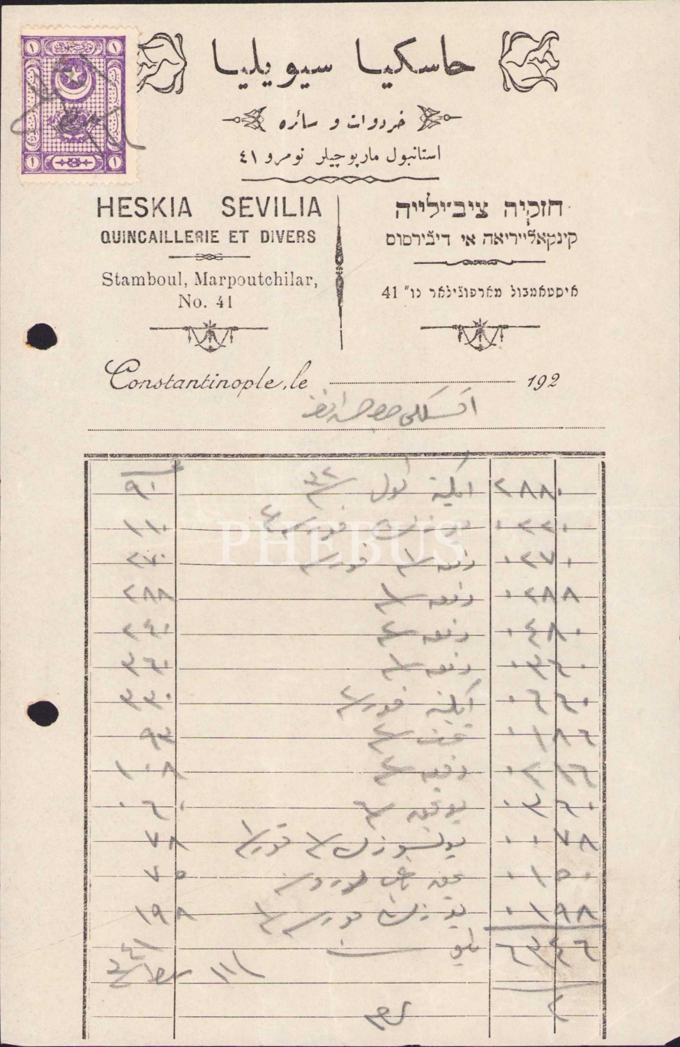 Hırdavatçı Heskia Sevilia Constantinople antetli fatura, İbranice, Fransızca ve Osmanlıca üç dilde, 1920'ler, 15x23 cm