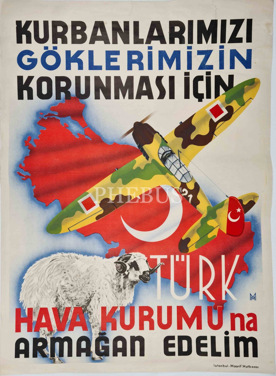 Türk Hava Kurumu afiş, "Kurbanlarımızı Göklerimizin Korunması İçin Türk Hava Kurumu'na Armağan Edelim, İstanbul Maarif Matbaası, 49x67 cm