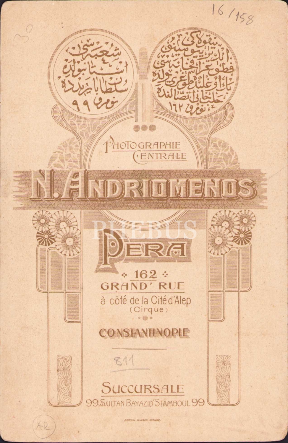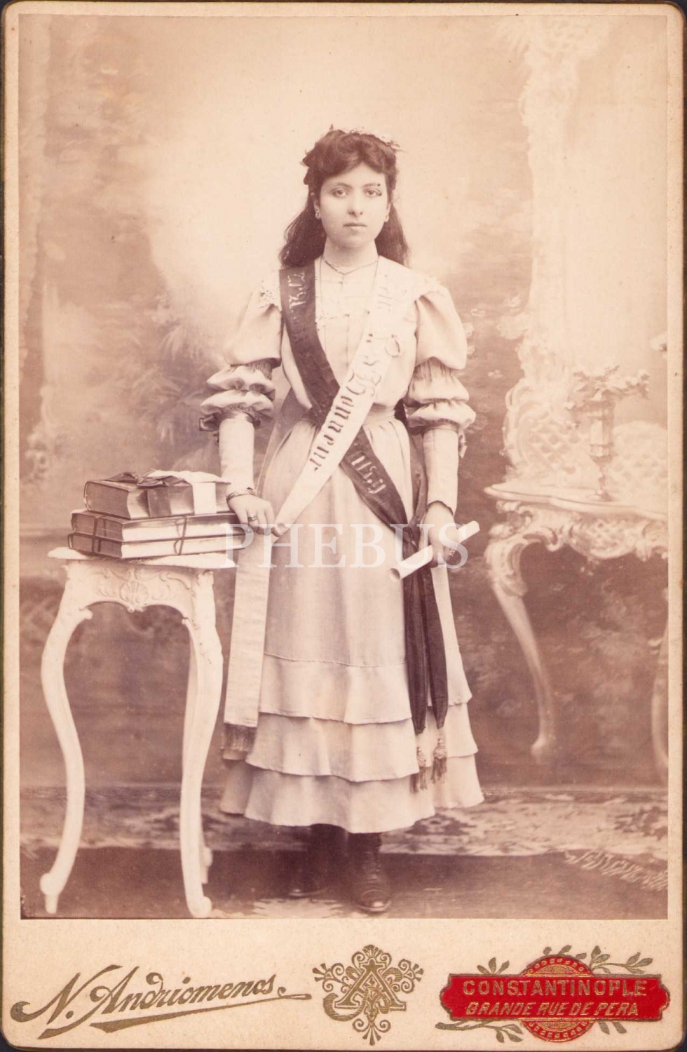 Ermenice ve Fransızca kuşaklı kız talebe, N. Andriomenos Constantinople kabin fotoğrafı, 10x16 cm