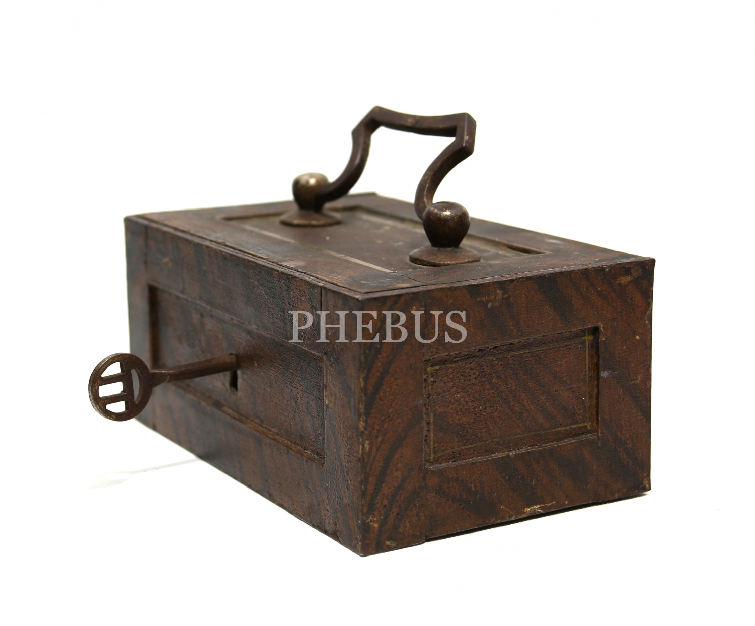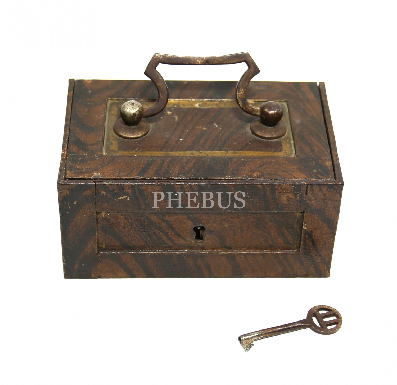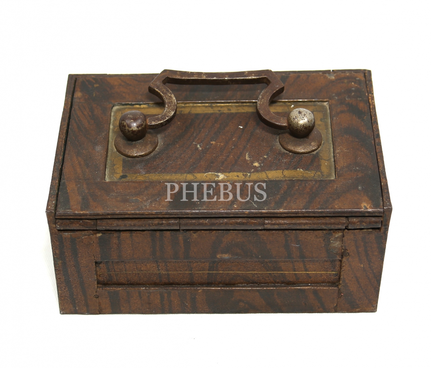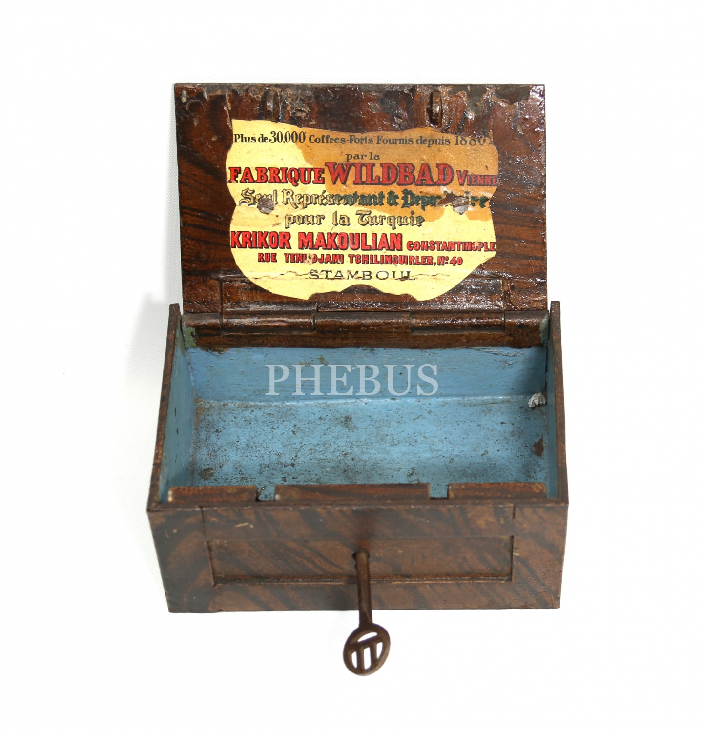 "Kilitli Ahşap masa kasası, Wildbad Viyana üretim, ithalatçı Ermeni ""Krikor Makoulian Constantinople"" etiketli, Stamboul [İstanbul], 15x10x8 cm"