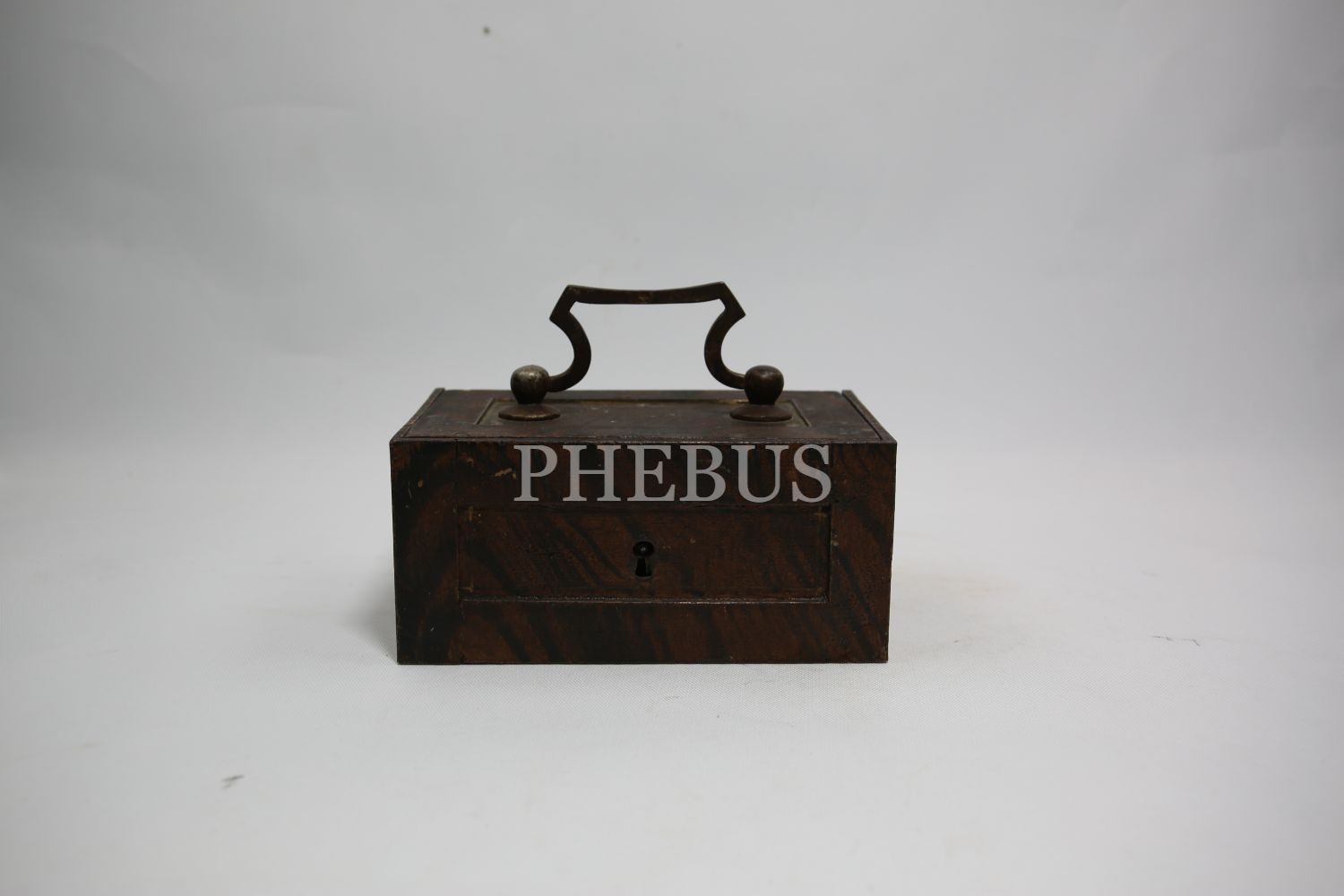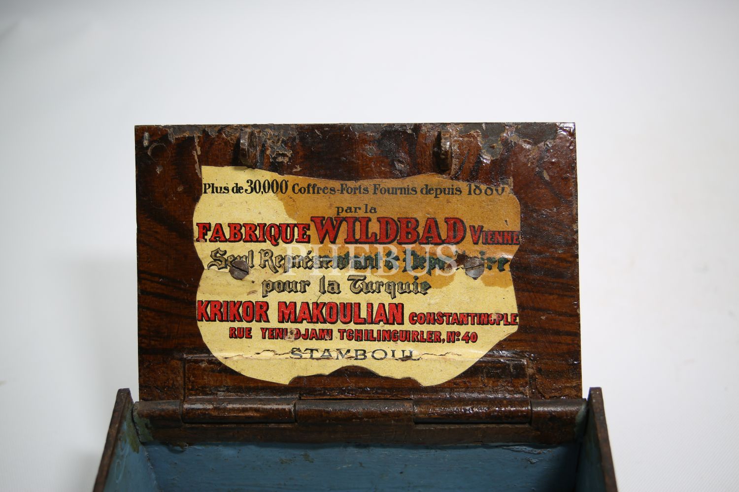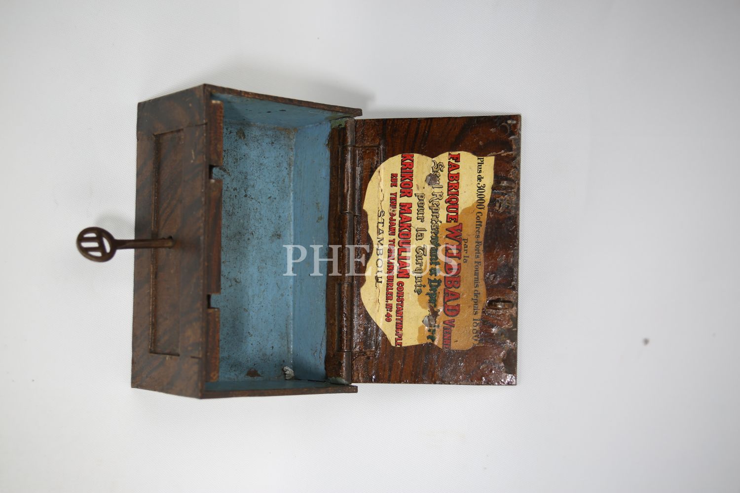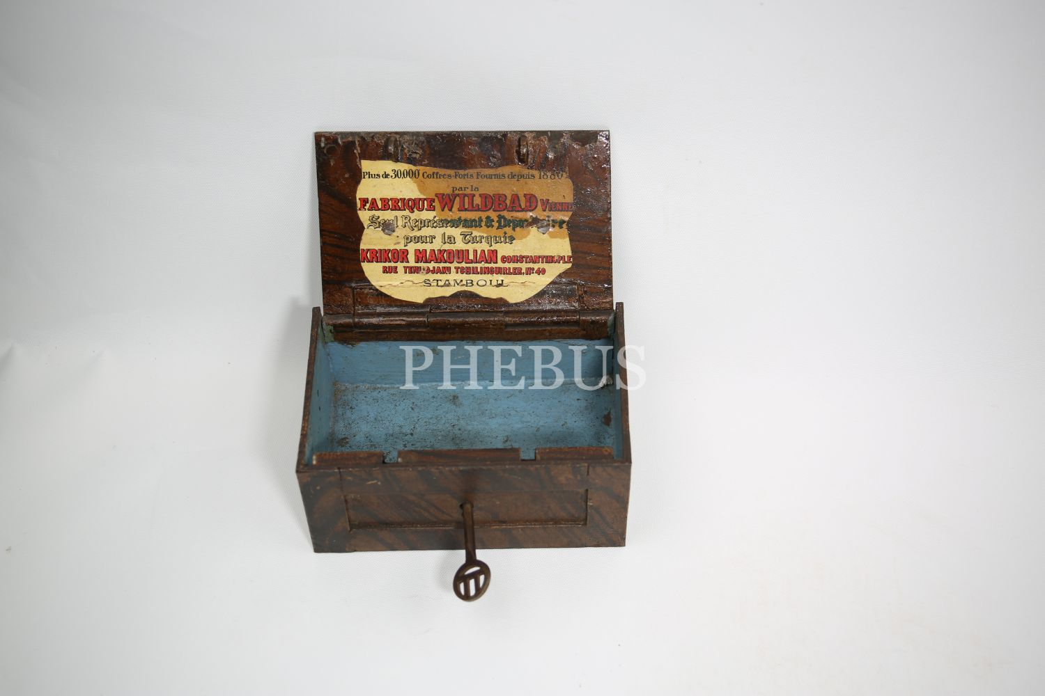 "Kilitli Ahşap masa kasası, Wildbad Viyana üretim, ithalatçı Ermeni ""Krikor Makoulian Constantinople"" etiketli, Stamboul [İstanbul], 15x10x8 cm"