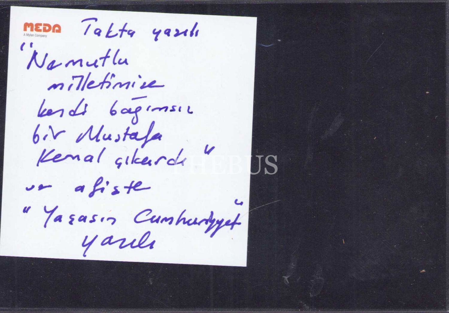 Fotoğrafta, "Yaşasın Cumhuriyet" yazılı pankart ve "Ne Mutlu Milletimize kendi bağımsız bir Mustafa Kemal [Atatürk] çıkardı" yazılı tak bulunmaktadır.