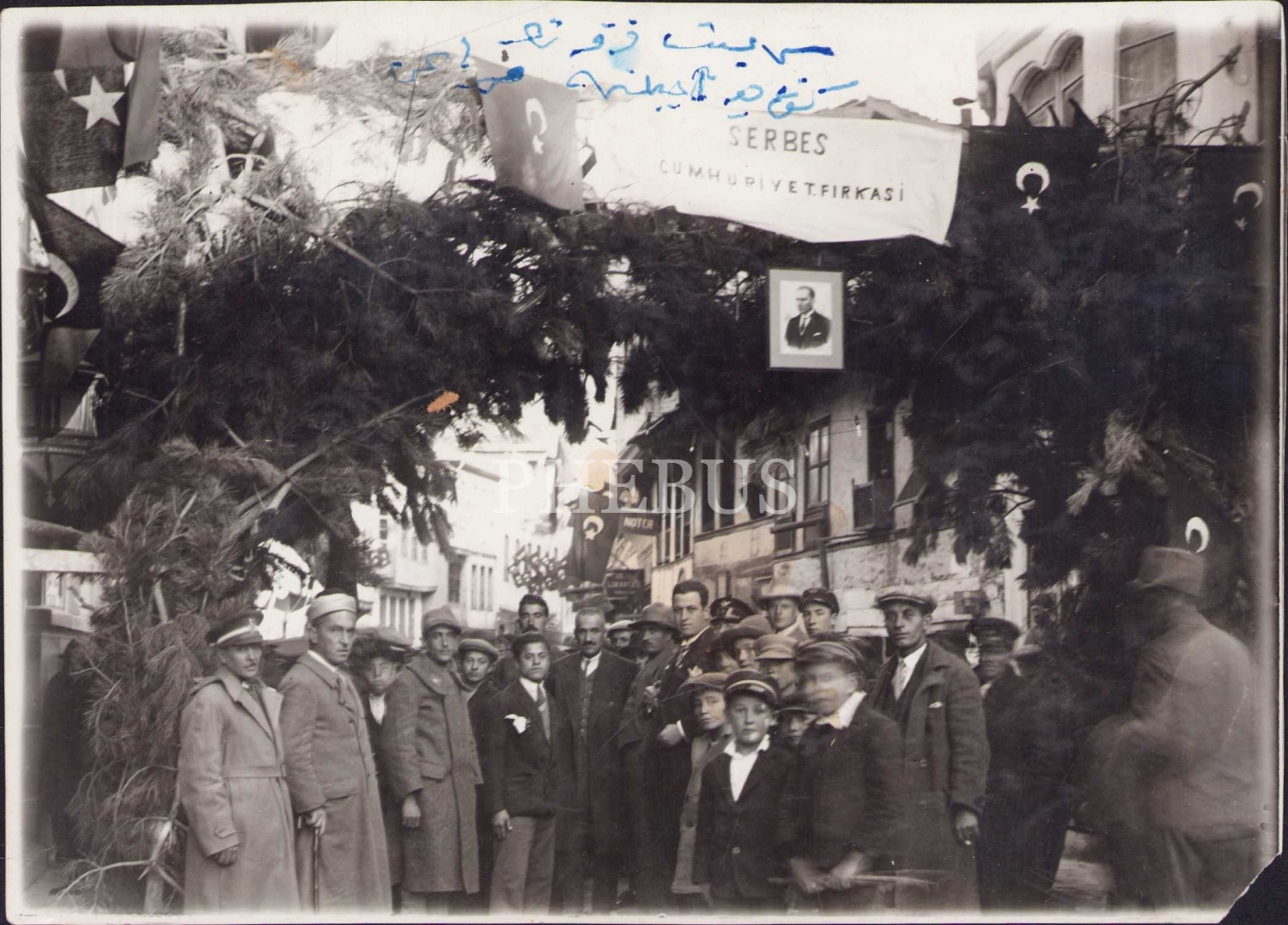 Serbest Cumhuriyet Fırkası ilçe örgütü, "Serbes Cumhuriyet Fırkası" yazılı pankart ve Mustafa Kemal Atatürk resmi bulunmakta, Osmanlıca, 18x13 cm