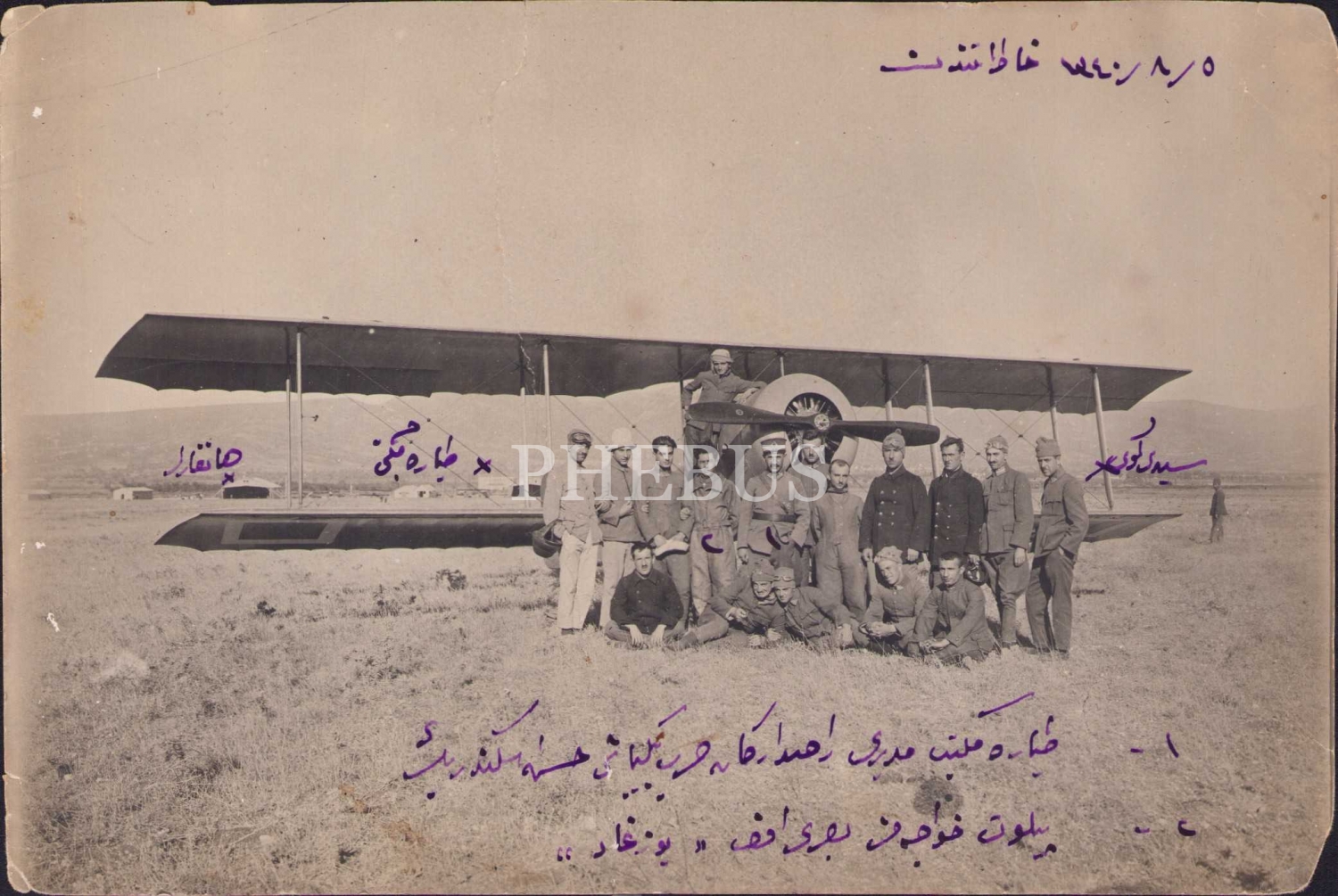 Seydiköy [İzmir] Tayyare Mektebi Hatırası, Tayyare Mektebi Müdürü Binbaşı İskender Bey ve Pilot Hocası Basri Efendi, ortadan tamirli, 1340 tarihli, 17x12 cm