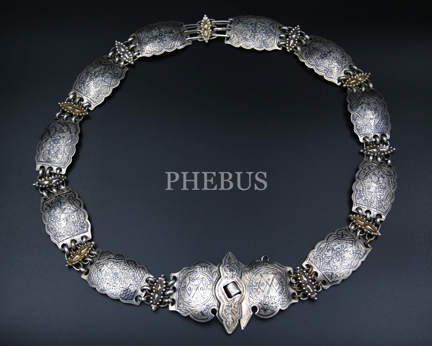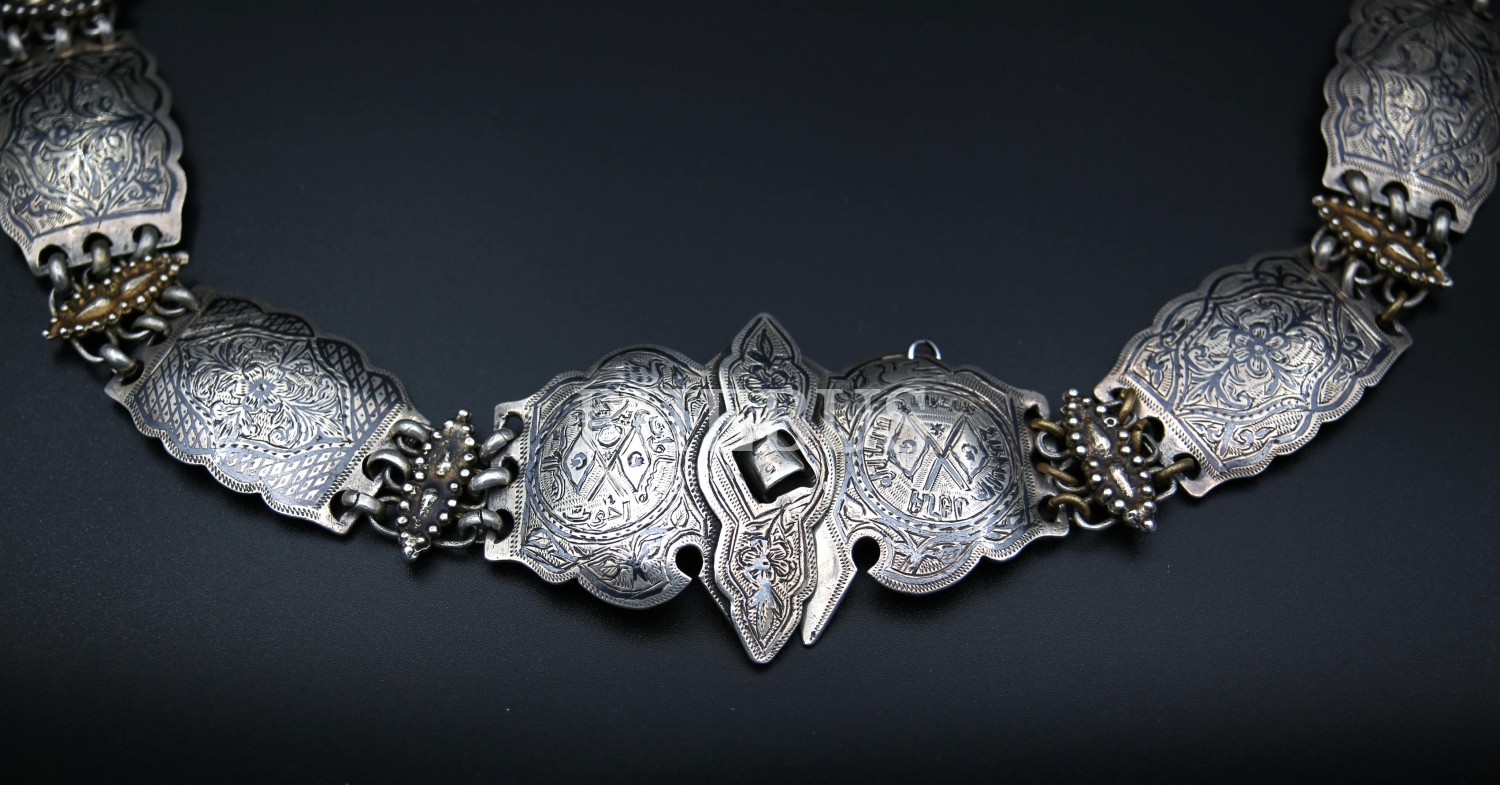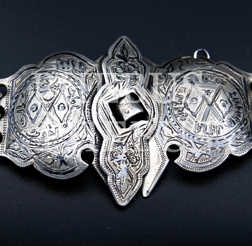 Gümüş Savatlı Meşrutiyet hatırası kemer, Ermenice ve Osmanlıca "Hürriyet, Adalet, Müsavat" yazılı, 73x5 cm
