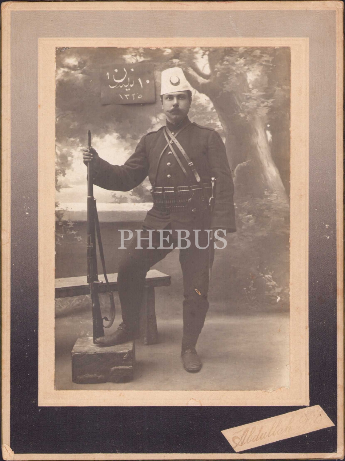 Meşrutiyet Hatırası asker kabin fotoğrafı, Abdullah Freres, arkası Osmanlıca ithaflı, 14x18 cm