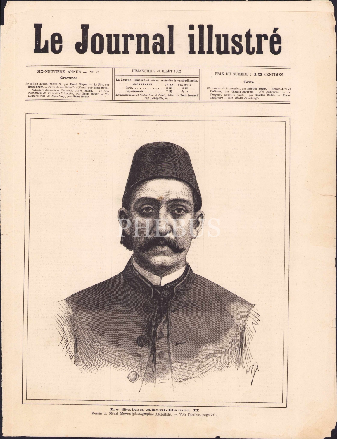 Le Journal İllustre, Kapak: Sultan II. Abdülhamid, "le Sultan Abdul-Hamid II", 2 Temmuz 1882 tarihli, 8 sayfa, Fransızca, 28x38 cm