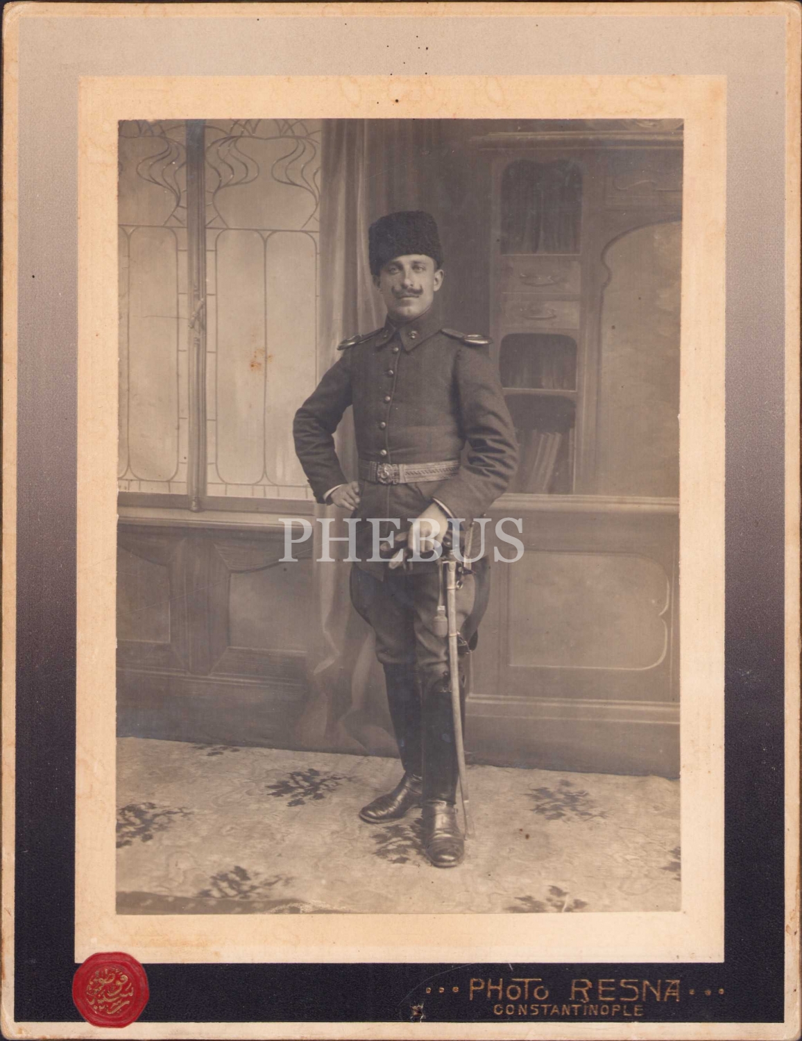 Kalpaklı ve üniformalı asker kabin fotoğrafı, Resne Fotoğrafhanesi, 17x22 cm
