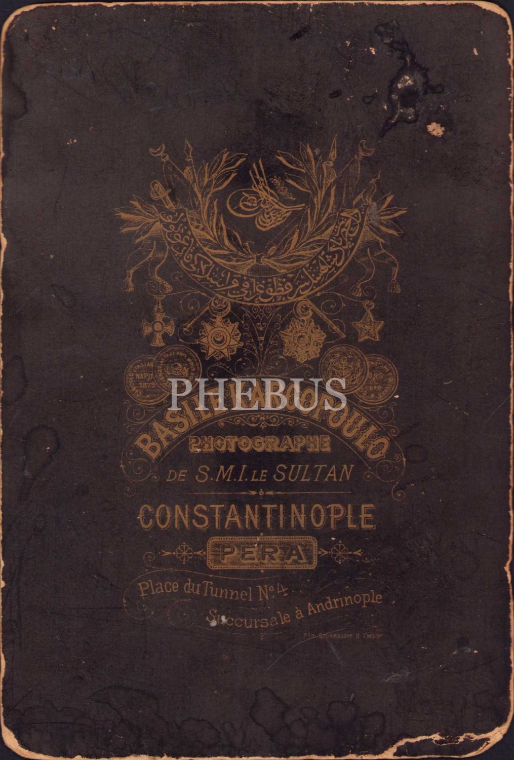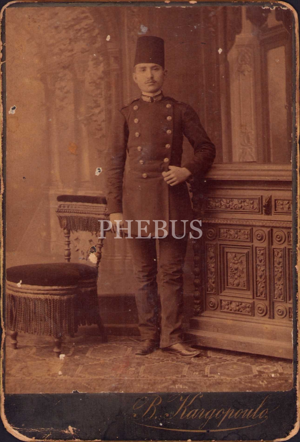 Fesli ve üniformalı asker kabin fotoğrafı, Basile Kargopoulo Fotoğrafhanesi, Constantinople, 11x16 cm