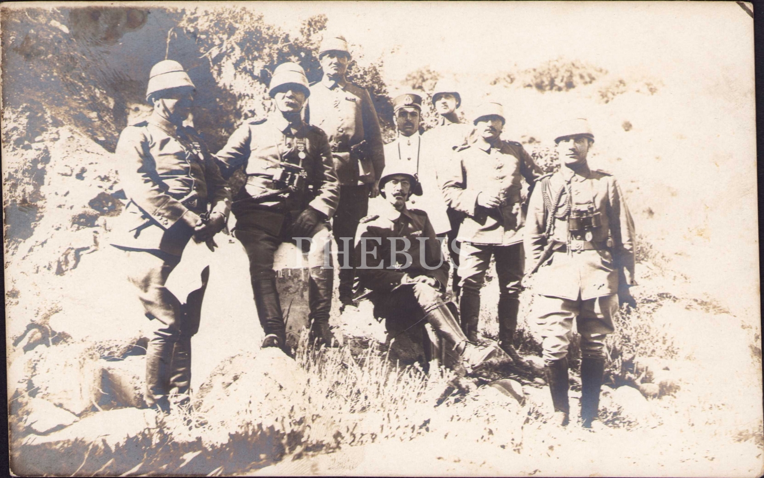 Birinci Cihan Harbi'nde madalyalı Yusuf İzzet Paşa ve Demir Haç madalyalı komutanlar Çanakkale Şimal Grubu'nun eski karargahında, 1334 tarihli, arkası Osmanlıca.