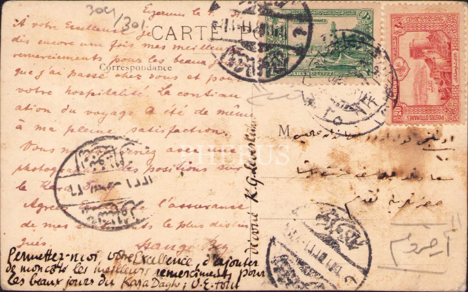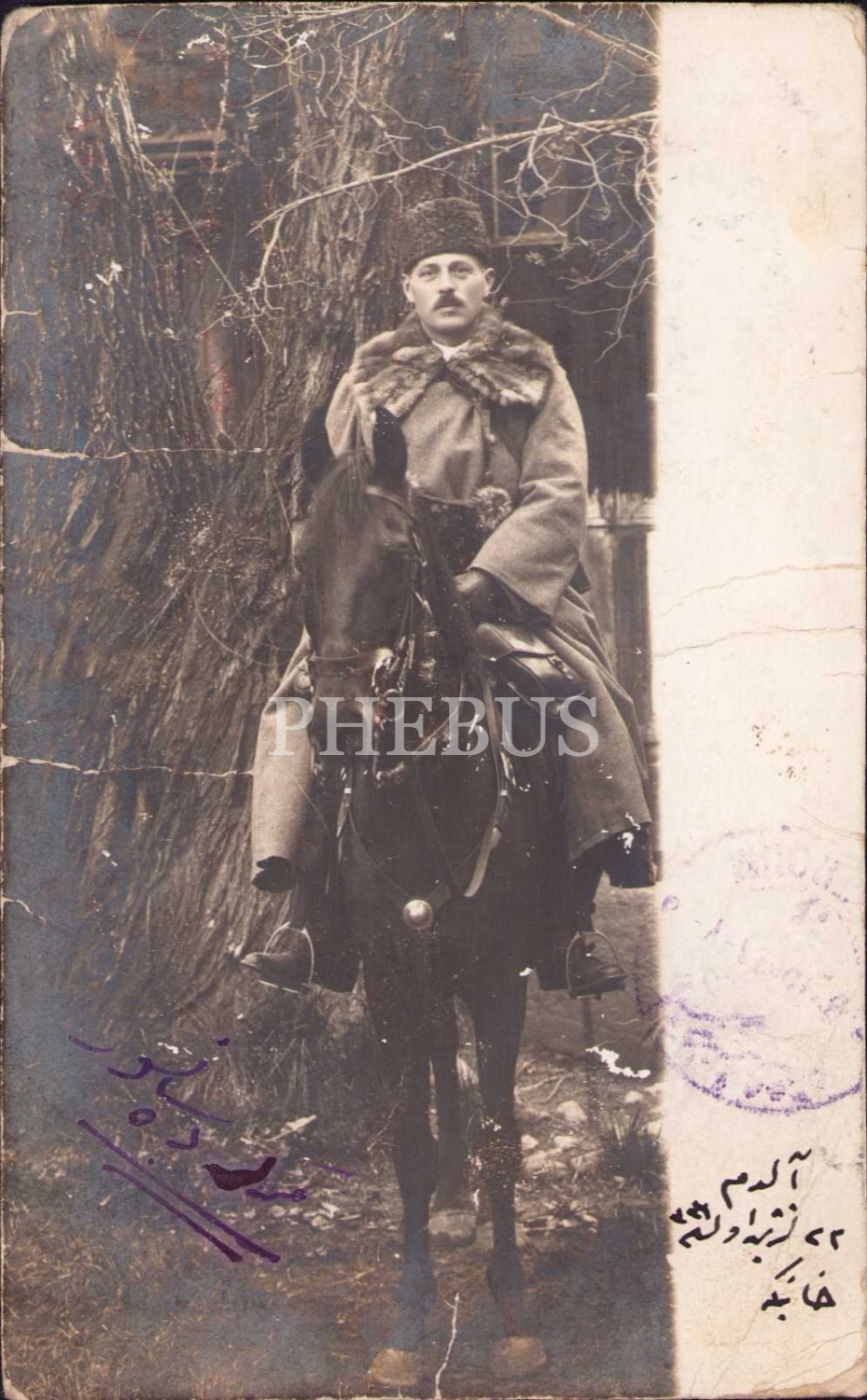 Birinci Cihan Harbi'nde Haneke'de [Sarıkamış] at üstünde kalpaklı subay, Yusuf İzzet Paşa'ya ithaflı, arkası Fransızca yazılı, damgalı ve pullu, postadan geçmiş.
