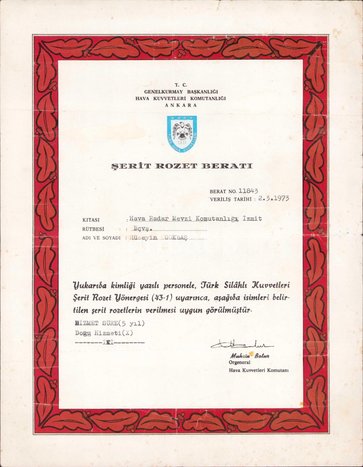 T.C. Genelkurmay Başkanlığı Hava Kuvvetleri Komutanlığı Şerit Rozet Beratı, 1973, haliyle, 23x30 cm