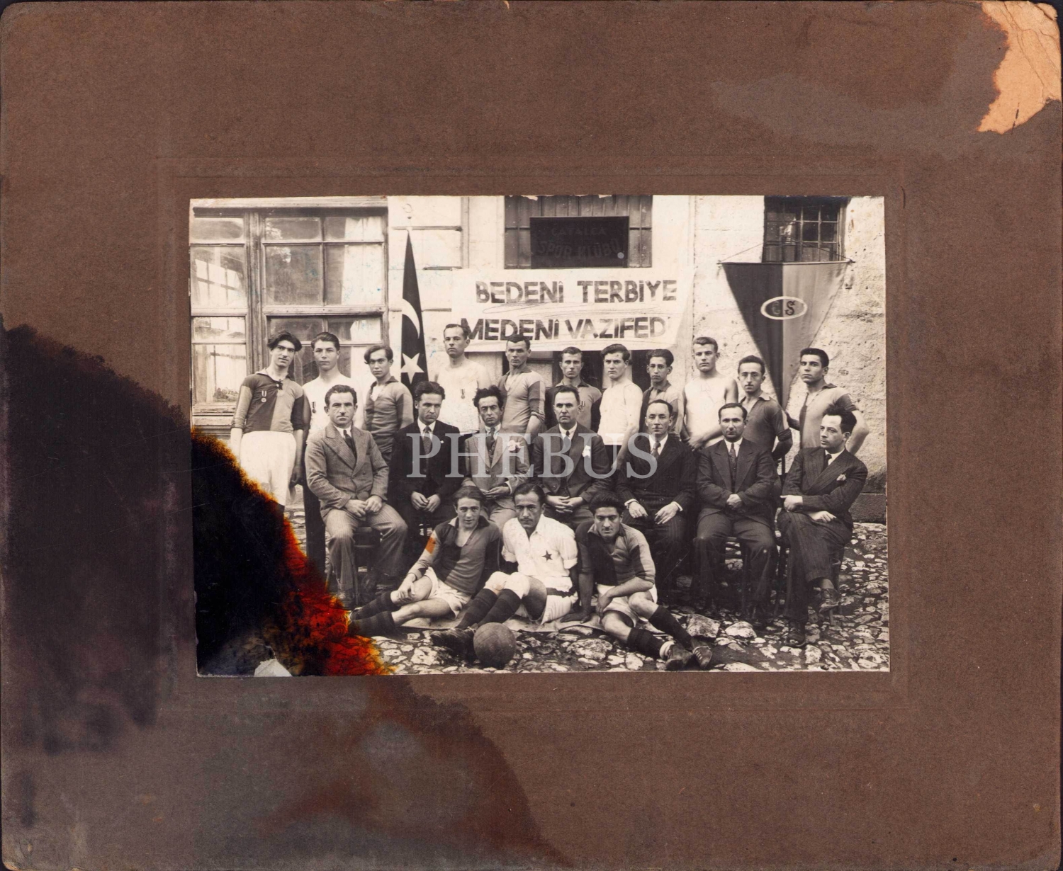 Galatasaray Spor Kulübü tabelası, Bedeni Terbiye Medeni Vazifedir pankartı önünde madalyalı sporcular hatıra, haliyle, 16x12 cm