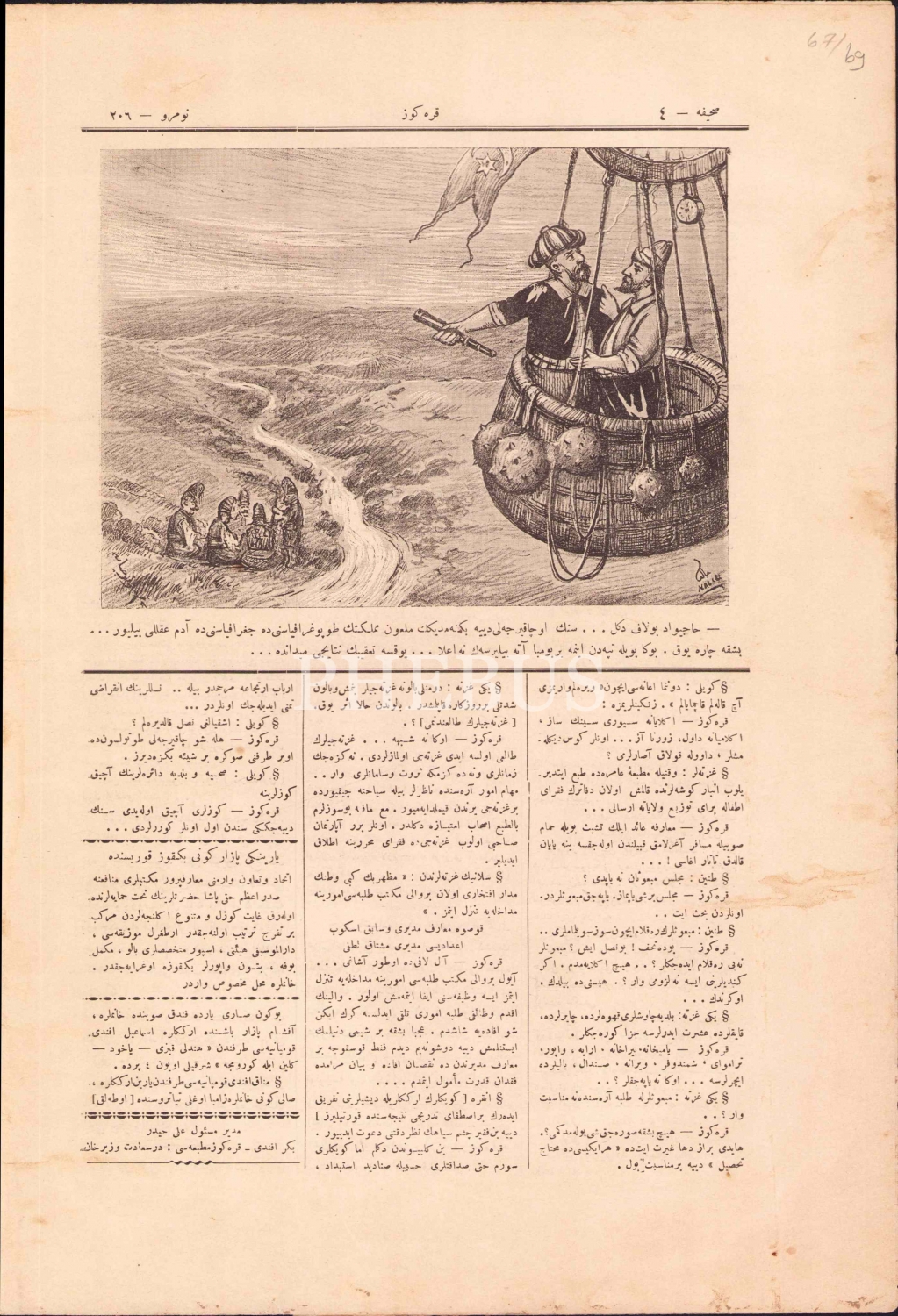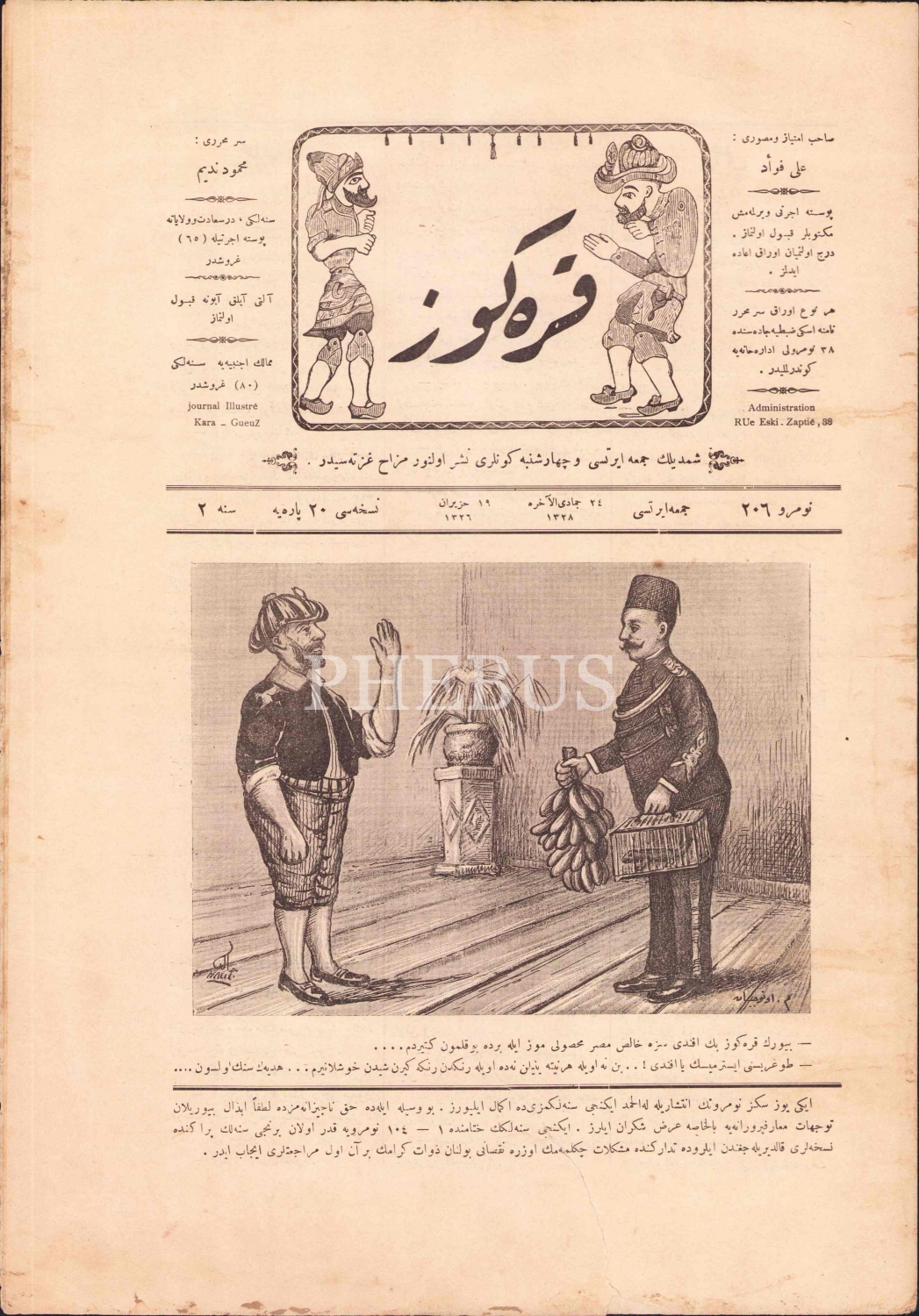 Osmanlıca, Karagöz mizah gazetesi, muharriri Mahmud Nedim, 1326, "Büyük Karagöz Beyefendi size halis Mısır mahsulü muz ile bukalemun getirdim..." 4 sayfa, 28x40 cm