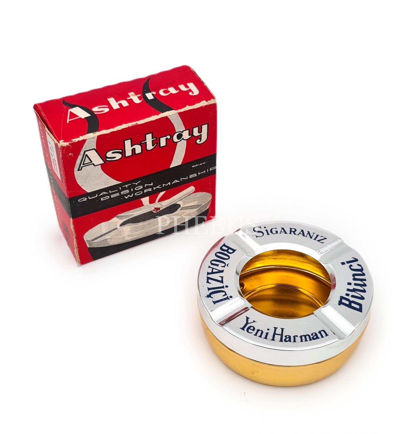 Ashtray, kutusunda, ''Boğaziçi, Yeni Harman ve Birinci'' Tekel sigaraları reklamlı küllük, 3x9 cm