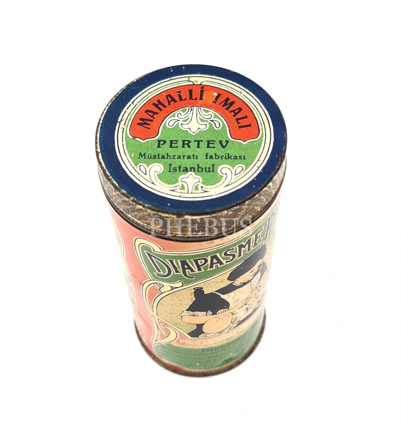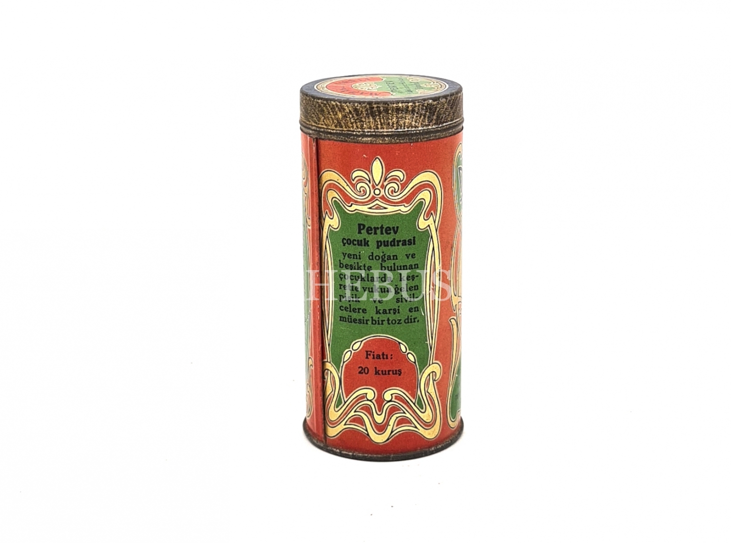 İki dilde Türkça-Fransızca, Pertev çocuk pudrası teneke kutu, 4x10 cm