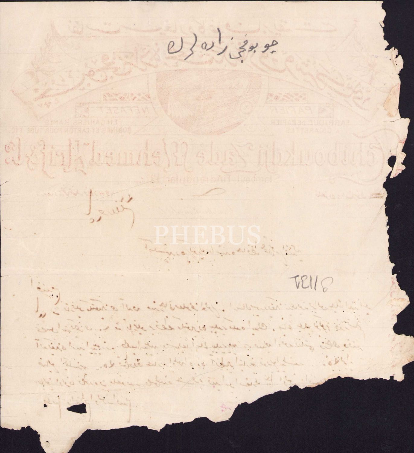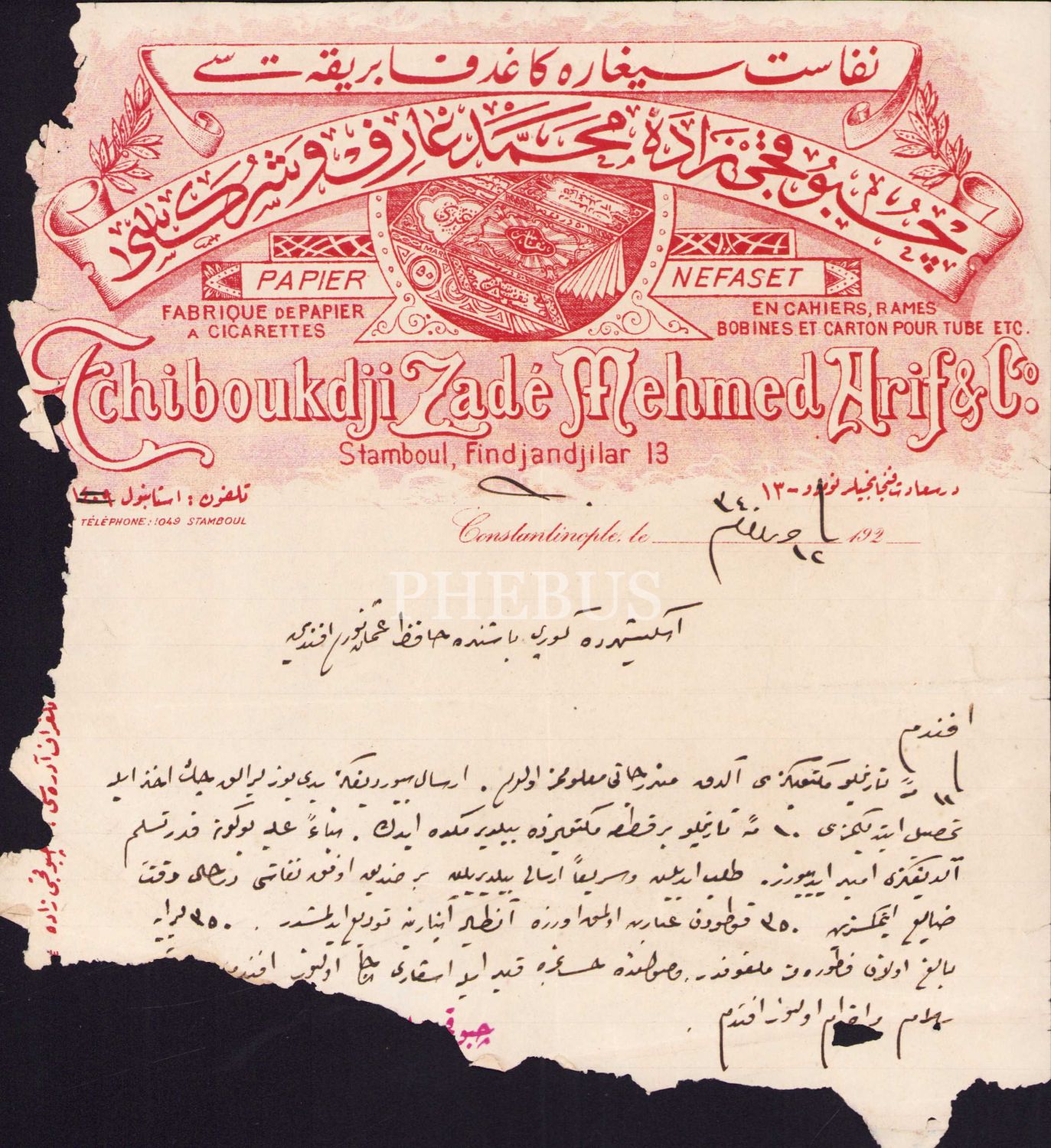 Osmanlıca Fransızca Nefaset Sigara Kağıdı Fabrikası Çubukçu Zade Mehmed Arif ve Şürekası antetli doküman, 1340, haliyle, 17x19 cm