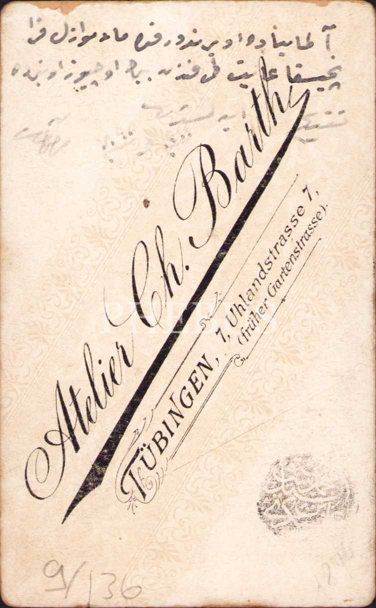 Atelier Ch. Barth, Tübingen, Osmanlı dönemi kadın tip, arkası Osmanlıca Almanya'da eğitim gören Türk zabitanı imzalı,ithaflı 1895, 6x9 cm