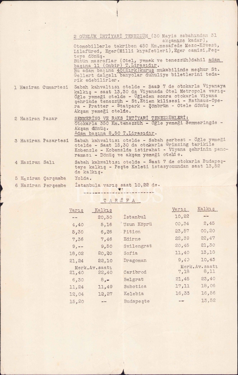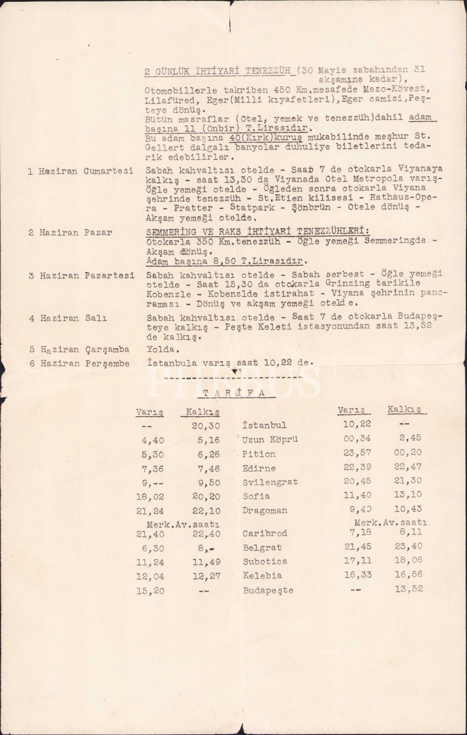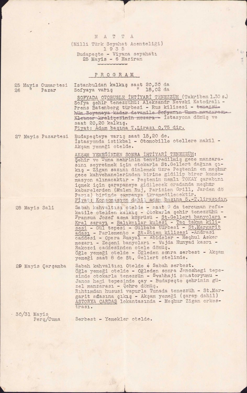 Natta - Milli Türk Seyahat Acenteliği 1935 Budapeşte - Viyana Seyahati Programı, 2 sayfa, 20x31 cm