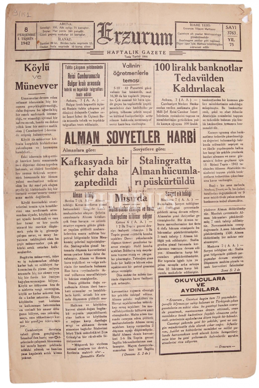 Erzurum haftalık gazete, Erzurum Vilayet Matbaası, 1942, "Alman Sovyetler Harbi", sayfa kenarları yırtık, 33x48 cm
