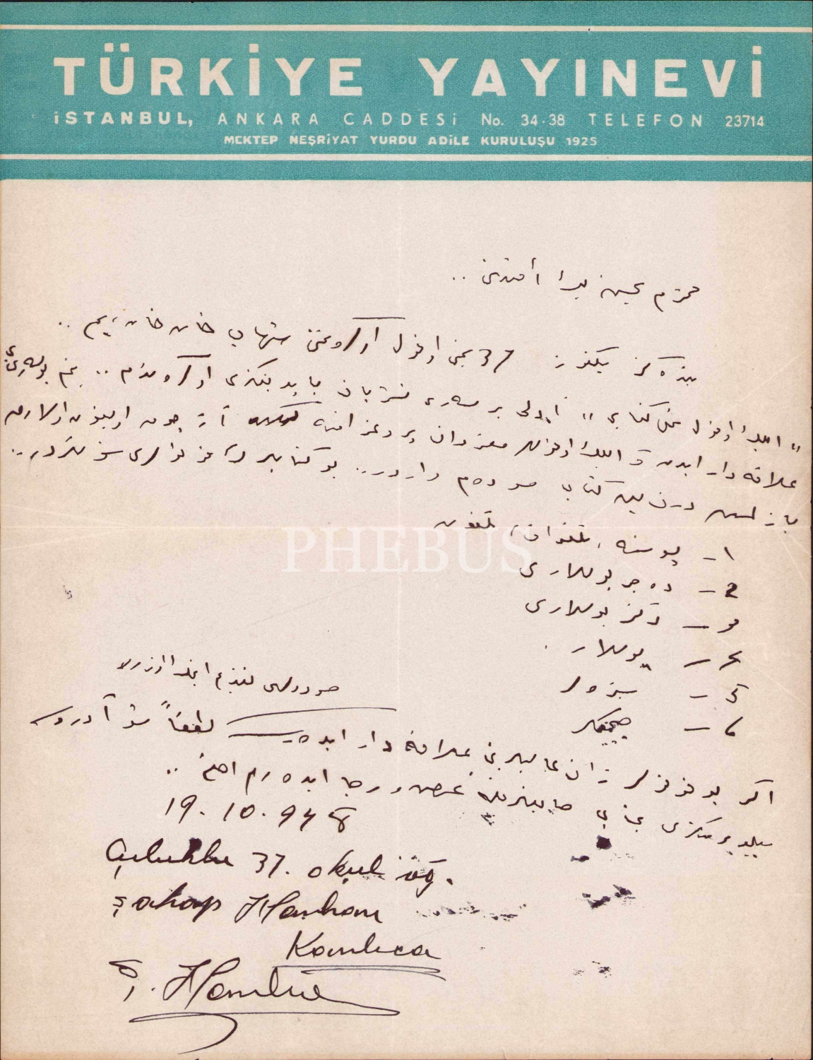 Türkiye Yayınevi antetli Osmanlıca yazılı belge, 1948, 21x28 cm