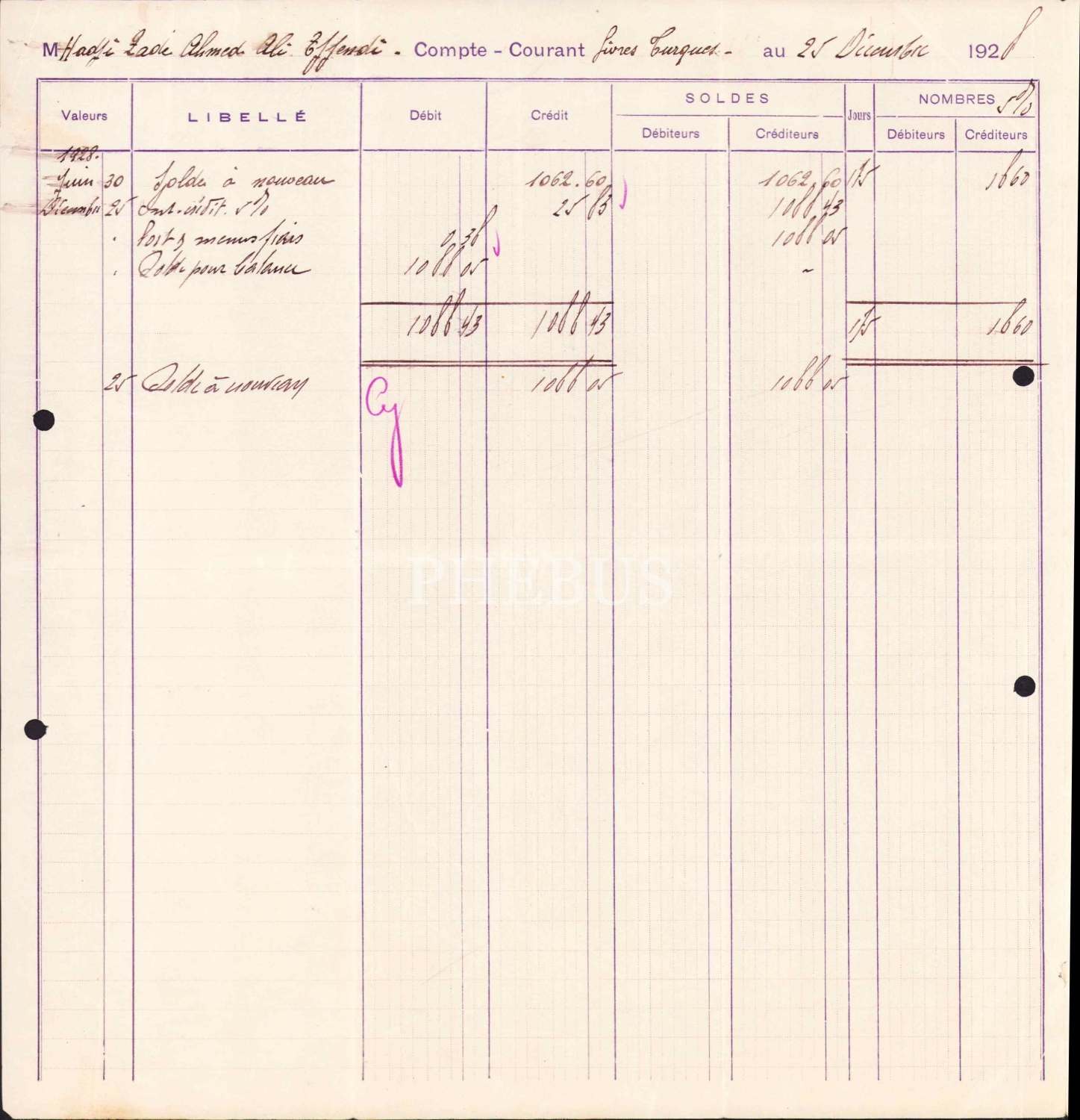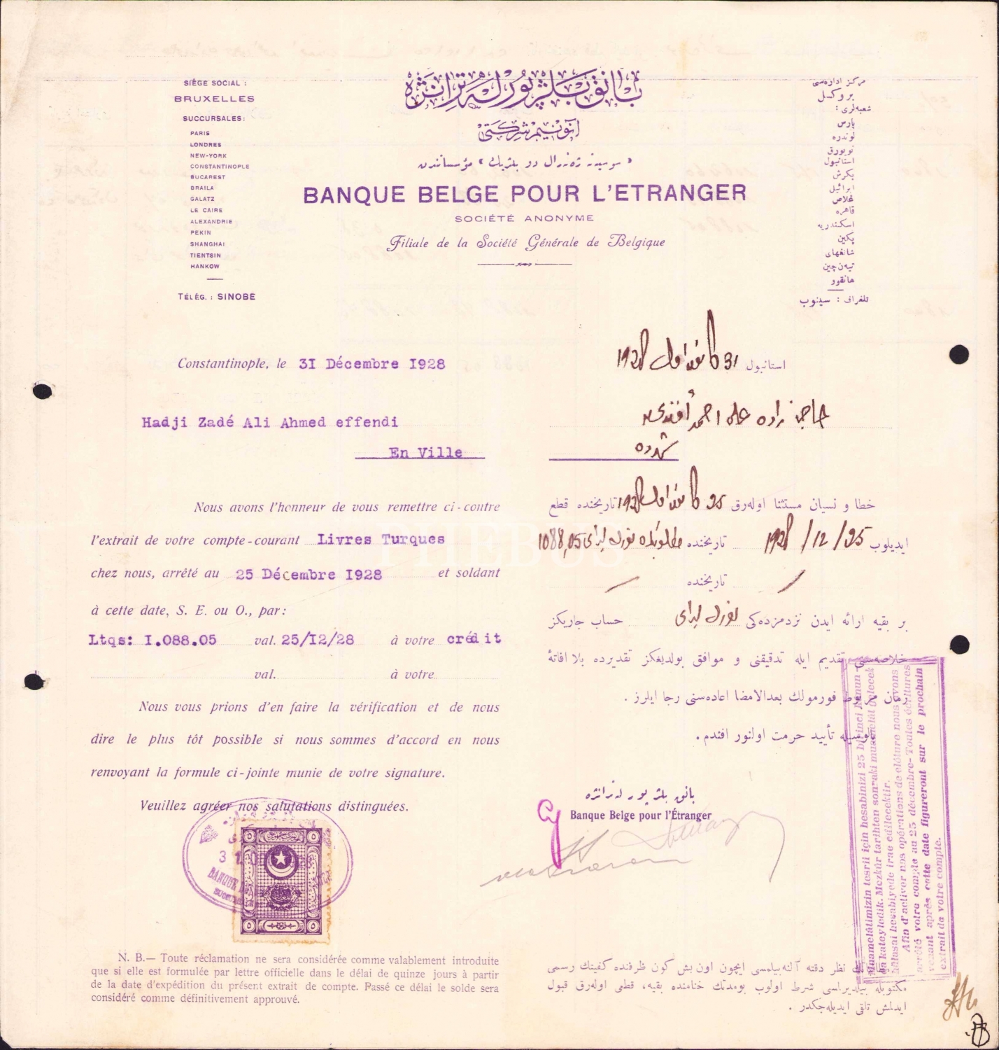 Osmanlıca Fransızca Banque Belge Pour L'Etranger, Belçika Bankası Anonim Şirketi banka evrakı, 2 sayfa, 27x28 cm