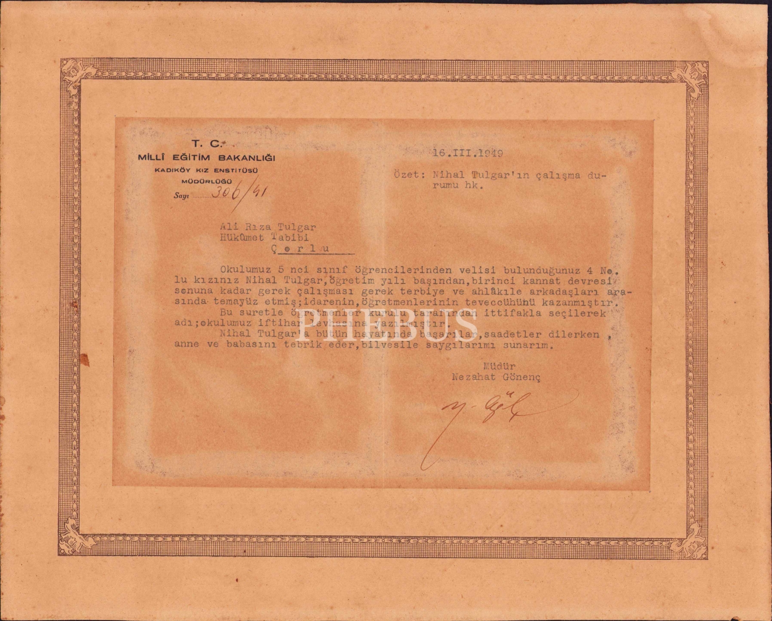 T.C. Milli Eğitim Bakanlığı Kadıköy Kız Enstitüsü teşekkür belgesi, 20x14 cm