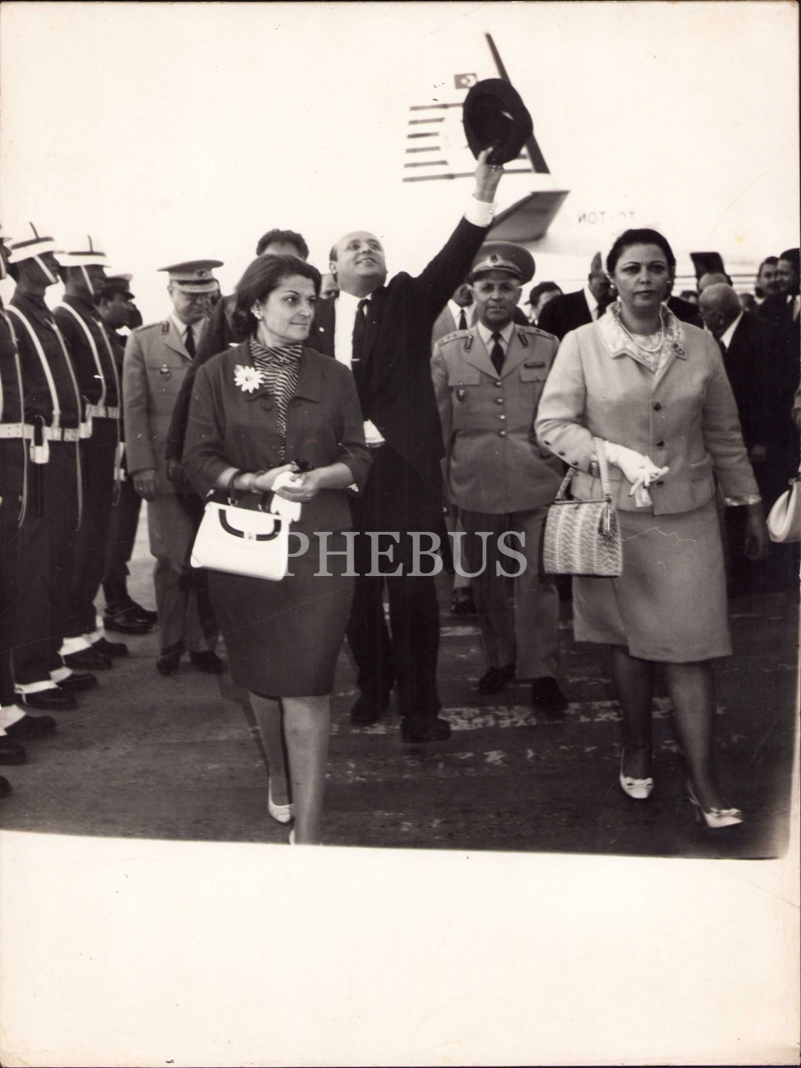 Türk Hava Yolları uçağından inip tören kıtası önünde halkı selamlarken Süleyman Demirel, 17x23 cm