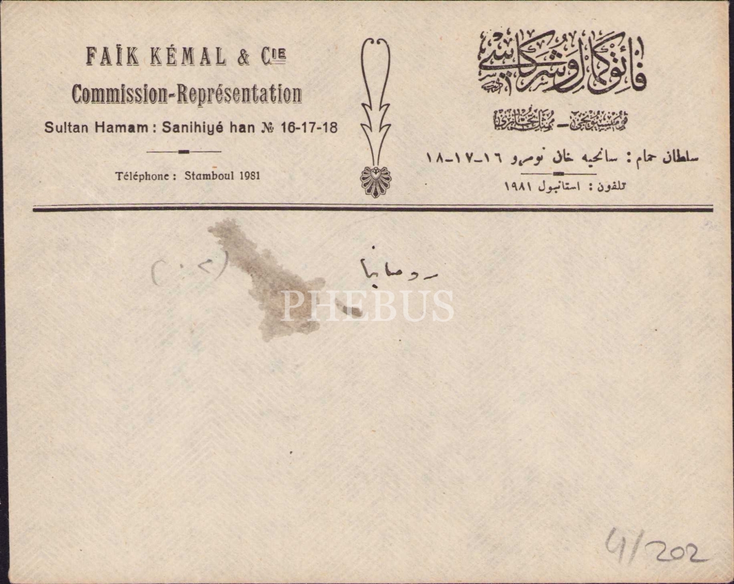 Faik Kemal ve Şürekası Komisyoncu antetli zarf, Osmanlıca - Fransızca