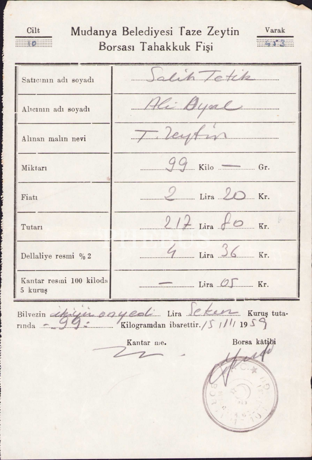 Mudanya Belediyesi Taze Zeytin Borsası Tahakkuk Fişi, 1959, 14x20 cm