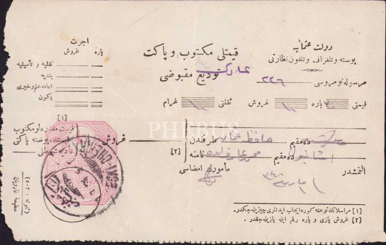 Devlet-i Osmaniye kıymetli mektup ve paket tevdi makbuzu, Osmanlıca, Eskişehir damgalı, 12x8 cm