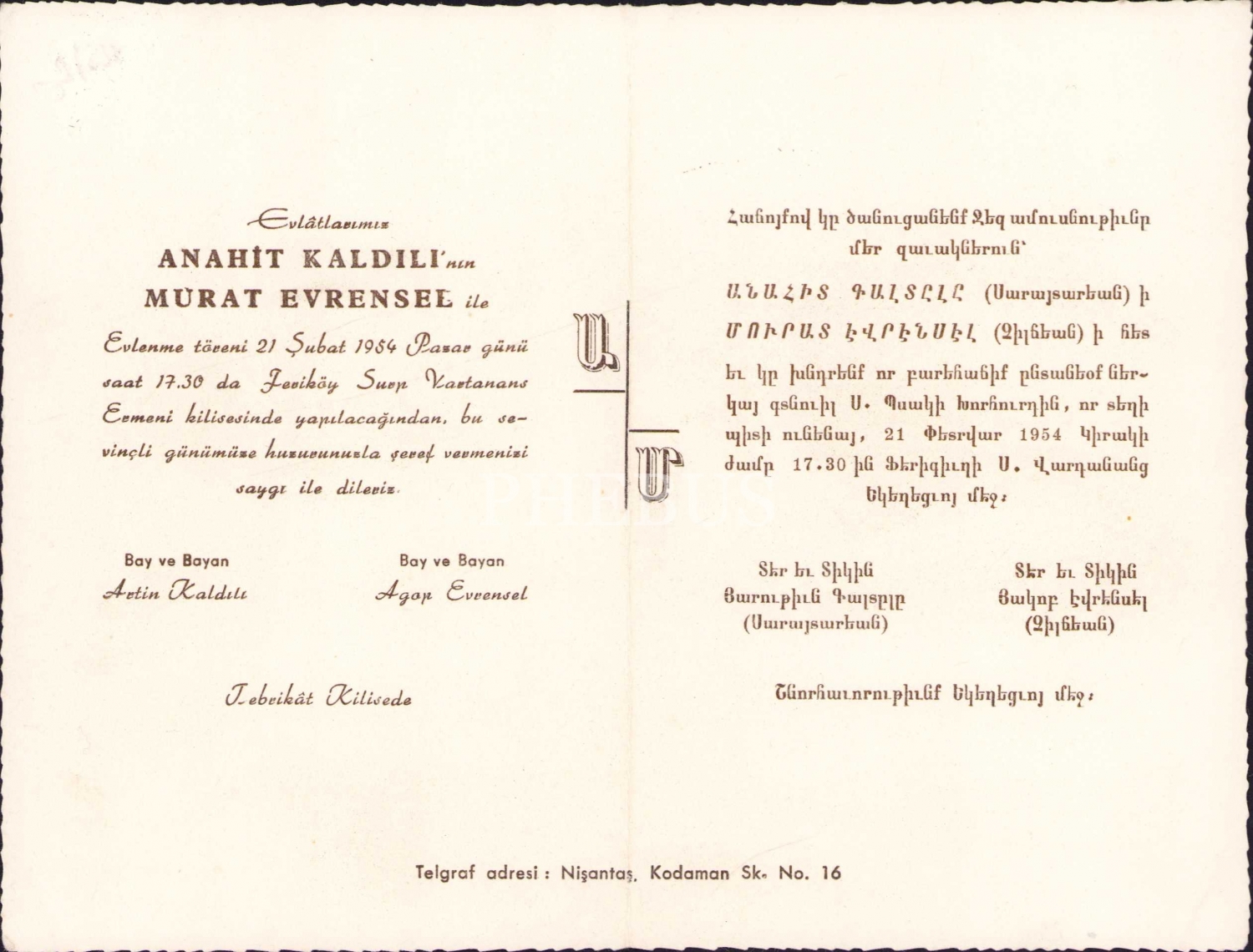 Anahit Kaldılı - Murat Evrensel Türkçe - Ermenice nikah töreni davetiyesi, 20x15 cm