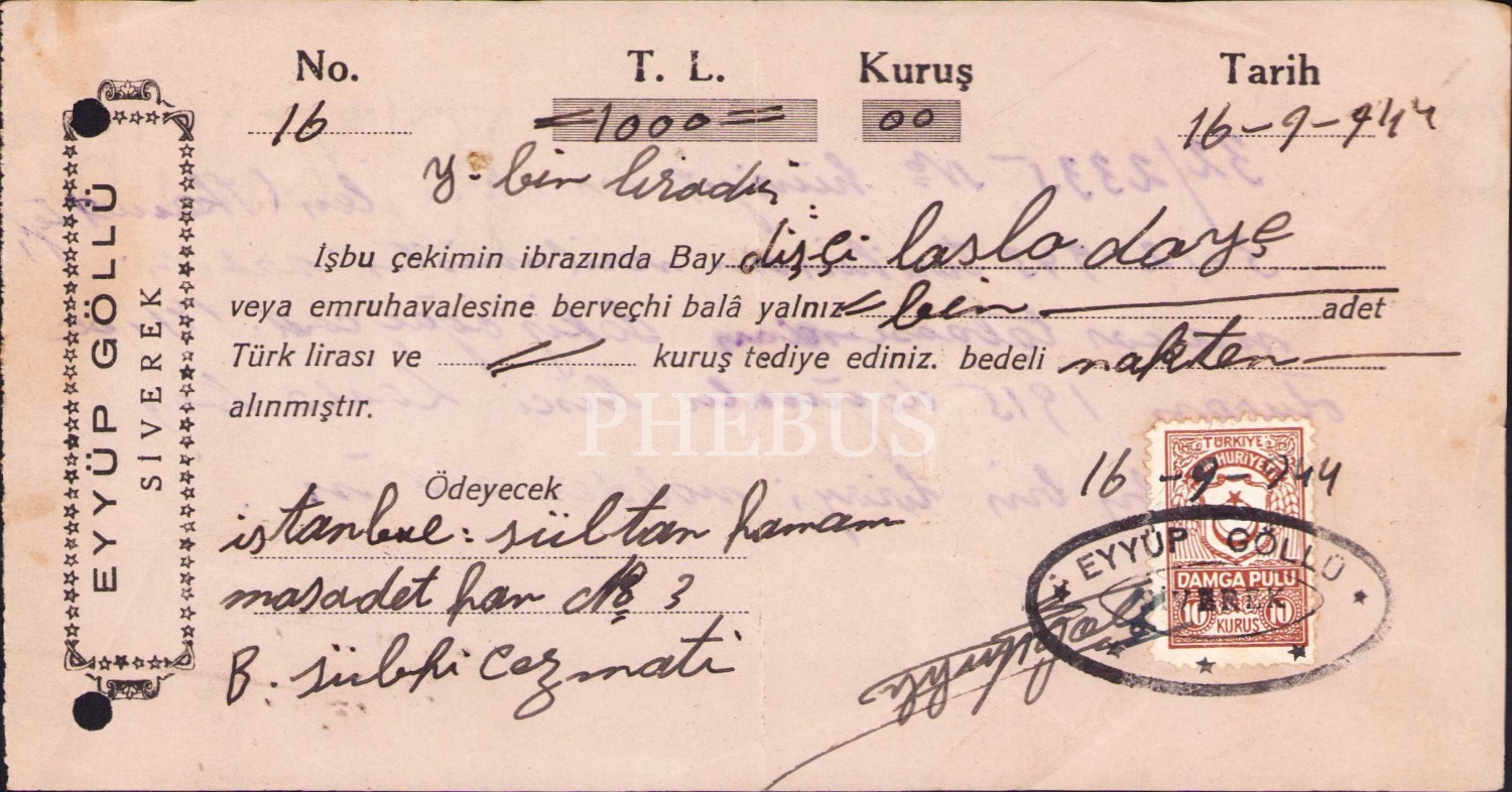 Eyüp Göllü Siverek antetli çek, 1944, 19x11 cm