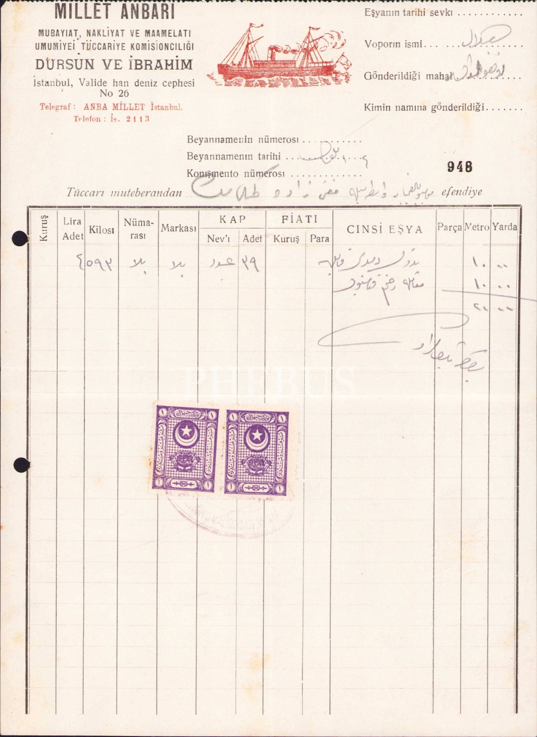Millet Ambarı Dursun ve İbrahim antetli fatura,18x24 cm