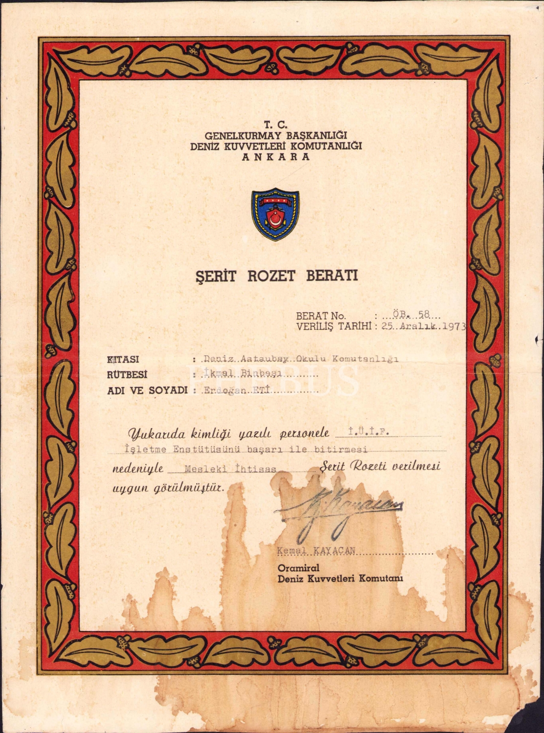 T.C. Genelkurmay Başkanlığı Deniz Kuvvetleri Komutanlığı Şerit Rozet Beratı, 1973, haliyle, 23x30 cm